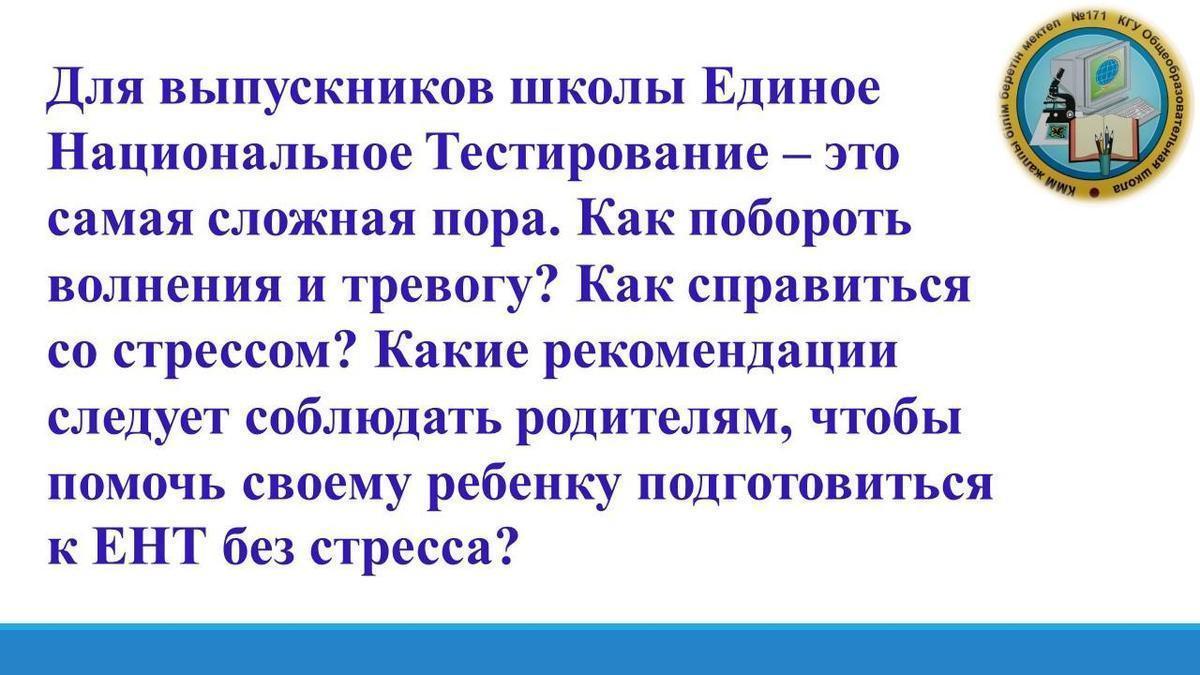 Для выпускников школы Единое Национальное Тестирование – это самая сложная пора. Как побороть волнения и тревогу? Как справиться со стрессом? Какие рекомендации следует соблюдать родителям, чтобы помочь своему ребенку подготовиться к ЕНТ без стресса?