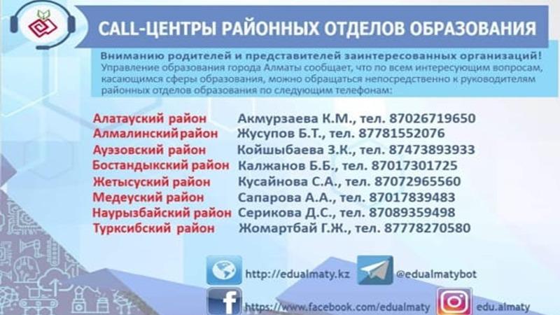 Управление образования города Алматы сообщает, что по всем интересующим вопросам, касающим ся сферы образования, можно обращаться непосредственно к руковводителям районных отделов образования по следующим номерам.