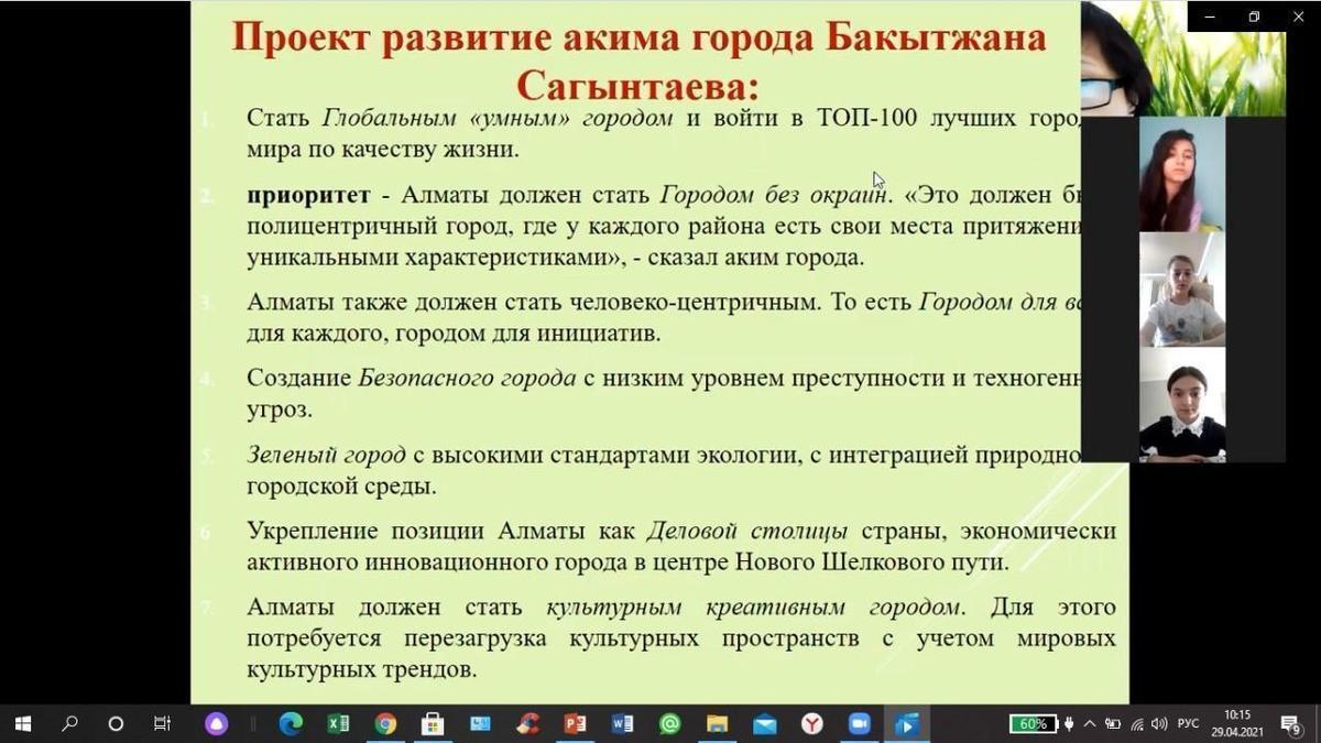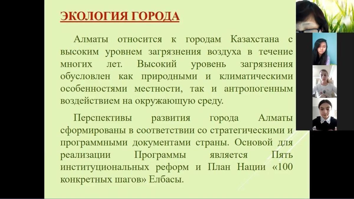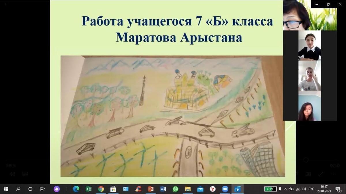 В КГУ ОШ 171 проведен конкурс проектов «Будущее моего города», в котором учащиеся школы предлагали свое видение развития нашего города через несколько лет, прогнозировали, к чему может привести рост частного транспорта, нехватка зеленых насаждений. Приятно, что учащиеся понимают важность охраны здоровья жителей города, имеют представление о экологичности: переработке мусора, переходе на альтернативные источники энергии, экологически чистые продукты и материалы, которые должны использоваться при создании современных объектов.