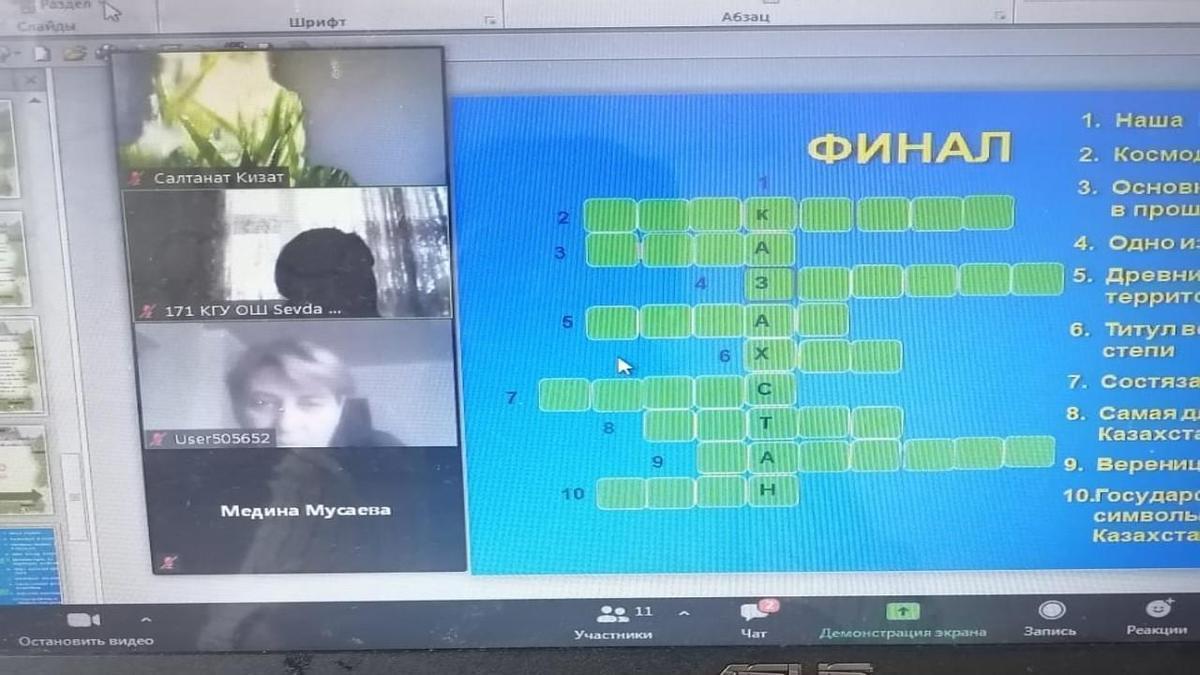 9-сыныптар арасында ZOOM платформасы арқылы өткен байқауға 11 мектеп қатысты: №14 ЖББМ, №82 ЖББМ, №91 ЖББМ, №114 ЖББМ, №151 ЖББМ, №154 ЖББМ, №156 ЖББМ, №160 ЖББМ, №171 ЖББМ, №184 ЖББМ, №196 ЖББМ.