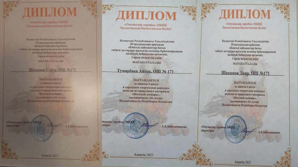 награждены дипломом за I место в городском творческом конкурсе поделок из природного материала «Веселый зоопарк», посвященный 30-летию Независимости Казахстан!