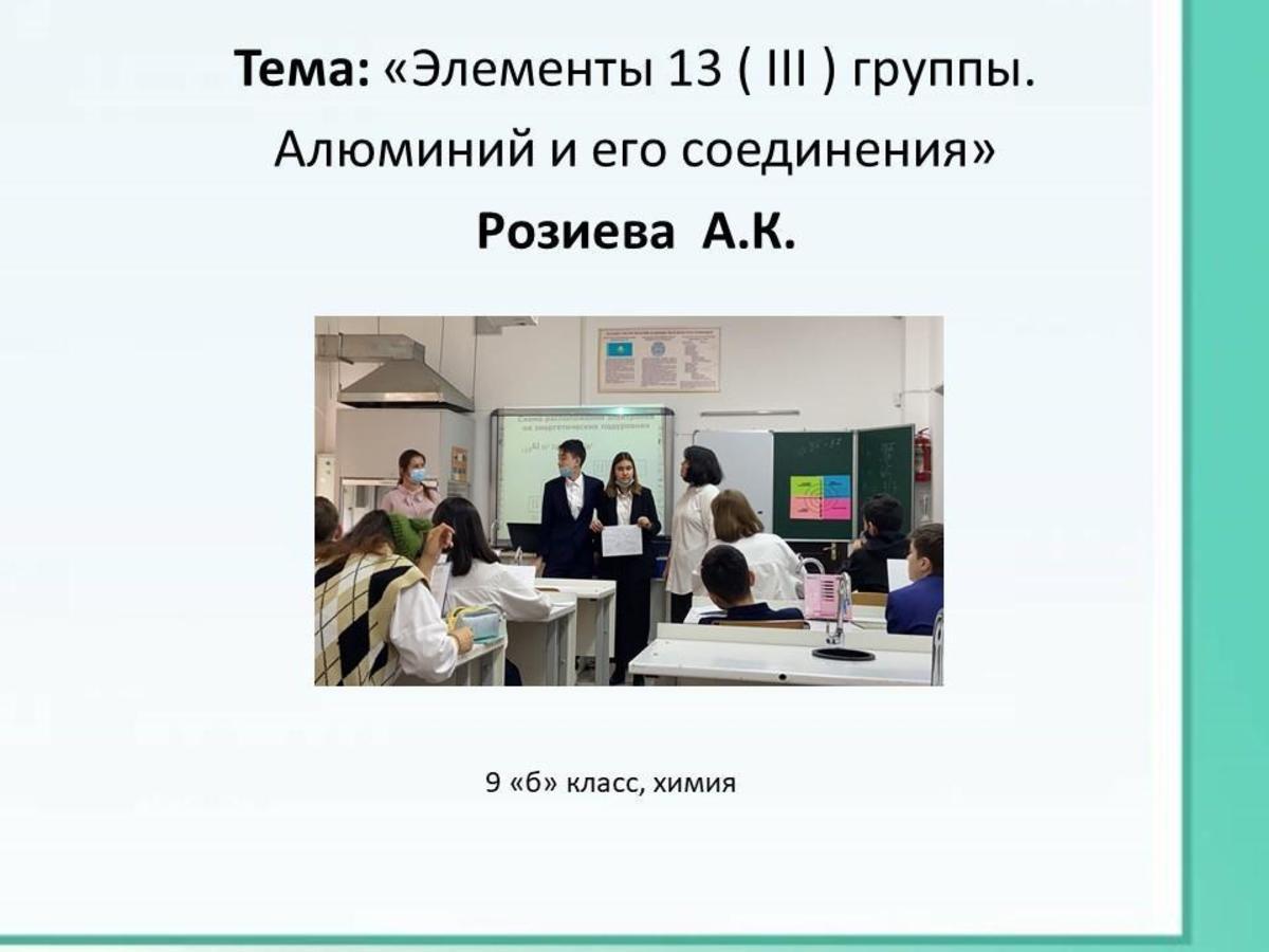 11 декабрь 2021 0 1 2 3 4 5 Розиева А.К. «Элементы 13 (III) группы. Алюминий и его соединения» В рамках Недели естественно-математических наук Розиева А.К. провела открытый урок на тему «Элементы 13 (III) группы. Алюминий и его соединения». Осы беттің QR-коды:QR-код этой страницы: