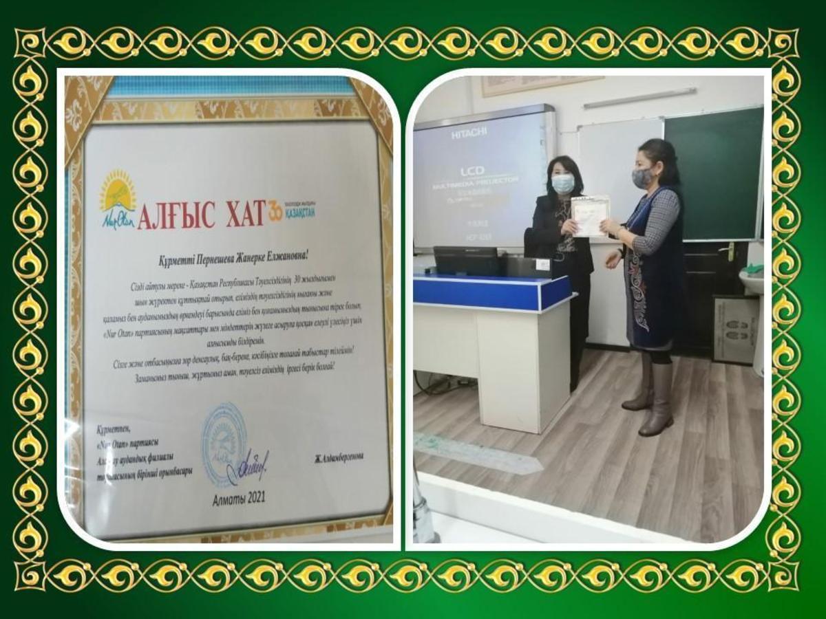 Қазақстан Республикасы Тәуелсіздігінің 30 жылдығына орай, еліміздің тәуелсіздігінің нығаюы және қаламыз бен ауылымыздың өркендеуі барысында еліміз бен қоғамымыздың тынысына тірек болып, «Nur Otan» партиясының мақсаттары мен міндеттерін жүзеге асыруға қосқан үлесі үшін №171 ЖББМ мұғалімі Пернешева Жанерке Елжановнаға алғыс білдірілді.