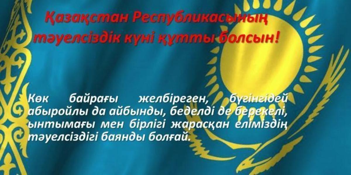 Ата-бабамыз ғасырлар бойы армандап өткен тәуелсіз ел болу мәртебесін көру - бүгінгі ұрпаққа бұйырған зор бақыт. Осы қуанышымыз құтты, бақытымыз баянды болсын. Жаңа ғасырда қайта түлеген, жасарып, түрленген еліміздің тәуелсіздігі баянды болғай! Кешегі арман, мақсаттарыңыз бүгінгі күні шындыққа айналсын. Атадан мирас болып қалған егемен еліміздің жарқын болашағы жолында аянбай еңбек ете берейік, еңселі Тәуелсіздігіміз құтты болсын!
