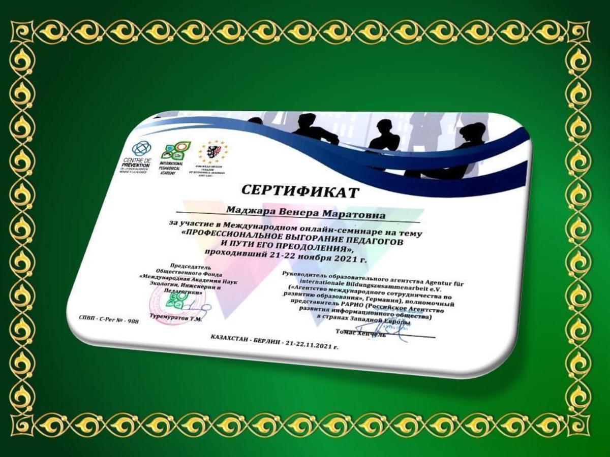 17 декабрь 2021 0 1 2 3 4 5 Маджара Венера Маратовна награждена сертификатом Маджара Венера Маратовна награждена сертификатом за участие в международном онлайн-семинаре «Профессиональное выгорание педагогов и пути его преодоления» Осы беттің QR-коды:QR-код этой страницы:
