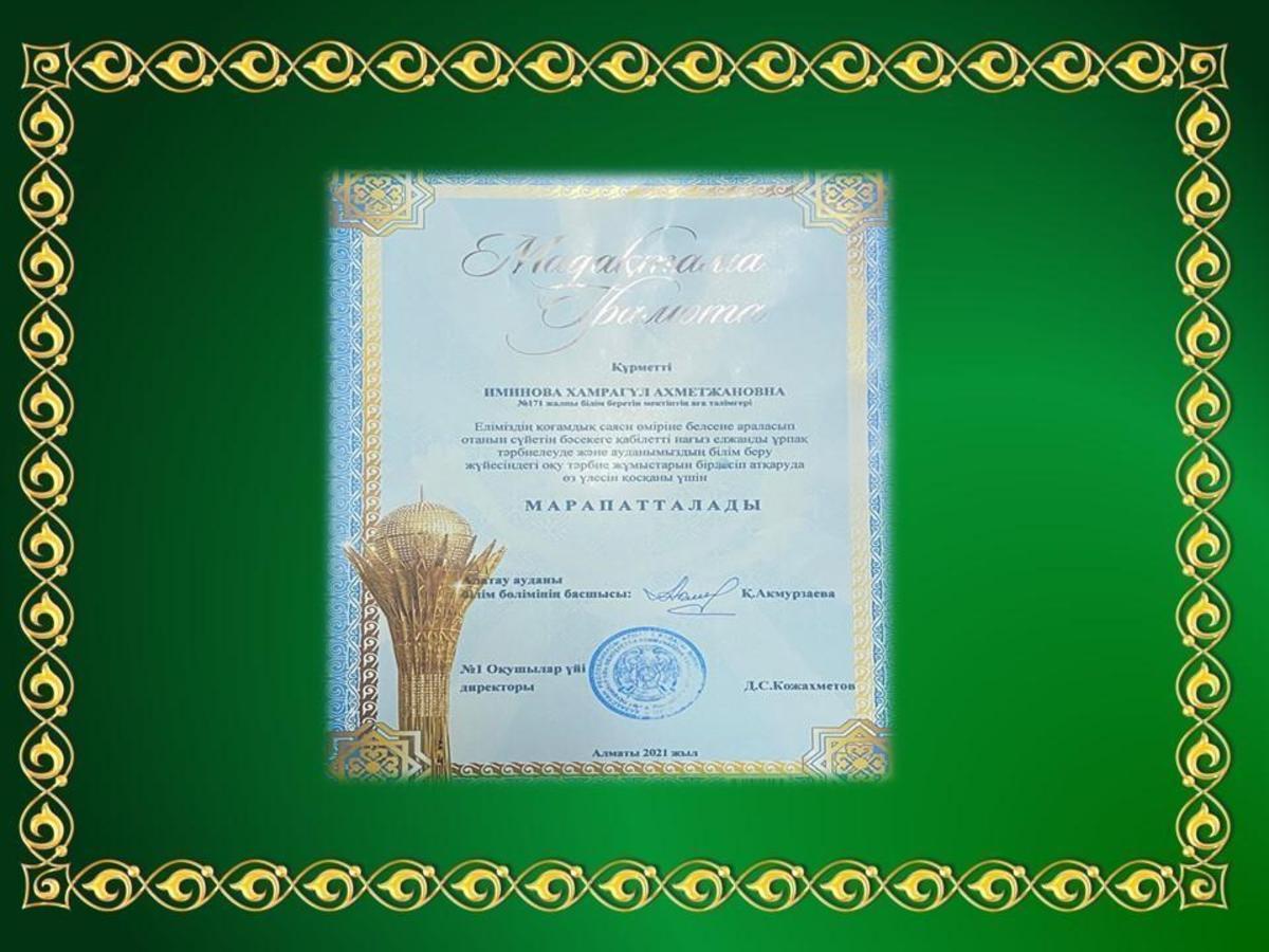Еліміздің саяси қоғамдық өміріне белсене араласып, Отанын сүйетін, бәсекеге қабілетті нағыз елжанды ұрпақ тәрбиелеуде және ауданымыздың білім беру жүйесіндегі оқу тәрбие жұмыстарын бірлесіп атқаруда өз үлесін қосқаны үшін №171 ЖББМ тәлімгері Иминова Хамрагул Ахметжановнаға алғыс білдірді.