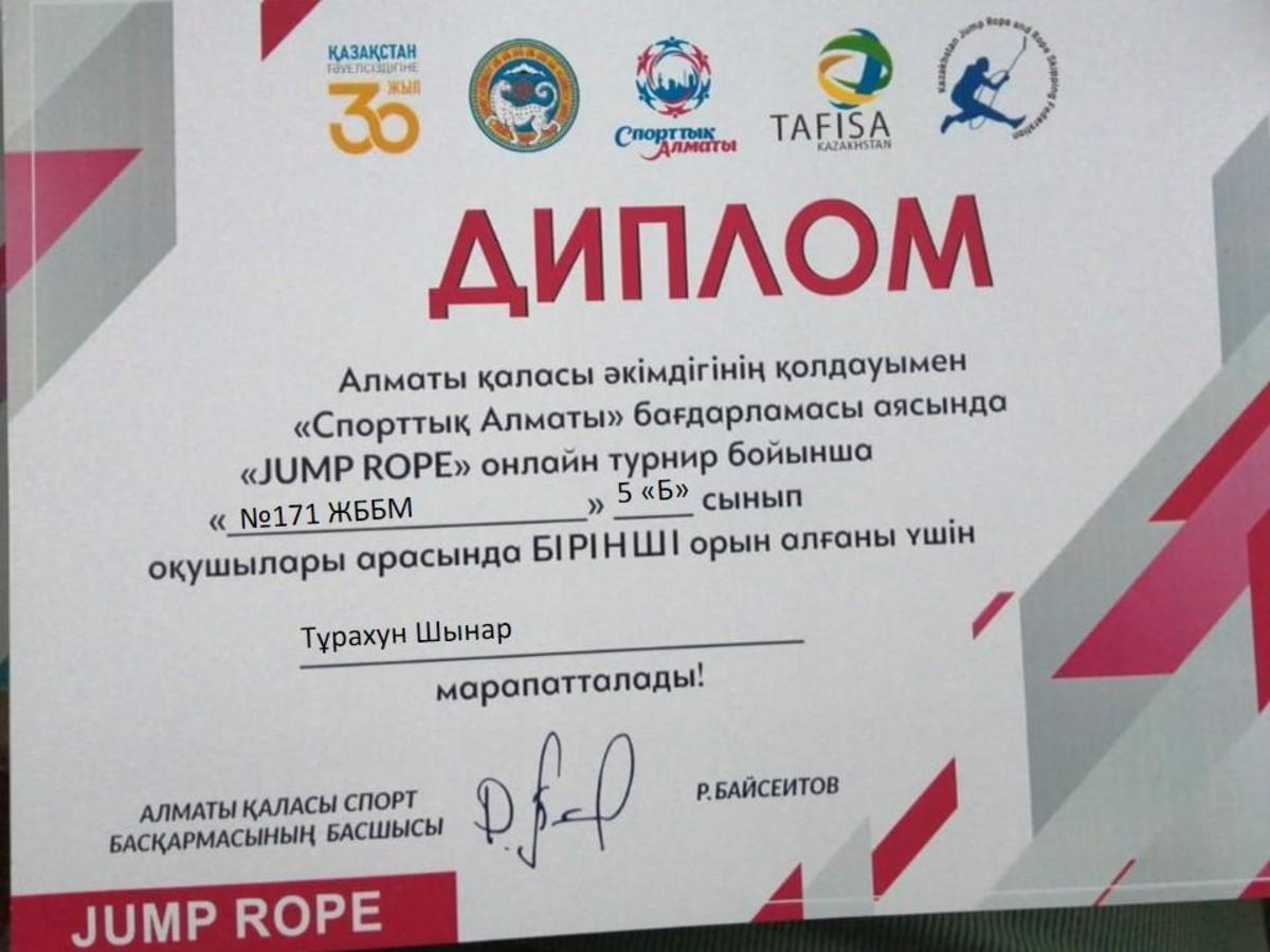 17 декабрь 2021 0 1 2 3 4 5 Бірінші орын иеленгендері үшін марапатталды. 5Б сынып Алматы қаласы әкімдігінің қолдауымен "Спорттық Алматы" бағдарламасы аясында өткен "JUMP ROPE" онлайн турнир бойынша N171 ЖББМ 5"Б" сынып оқушылары бірінші орын иеленгендері үшін марапатталды. Осы беттің QR-коды:QR-код этой страницы: