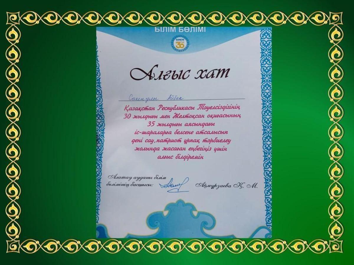 23 декабрь 2021 0 1 2 3 4 5 Сәкенұлы Айбекке алғыс білдірді Қазақстан Республикасы Тәуелсіздігінің 30 жылдығы мен Желтоқсан оқиғасының 35 жылдығы аясындағы іс-шараларға белсене атсалысып, дені сау, патриот ұрпақ трбиелеу жолында жасаған еңбегі үшін Сәкенұлы Айбекке алғыс білдірді. Осы беттің QR-коды:QR-код этой страницы: