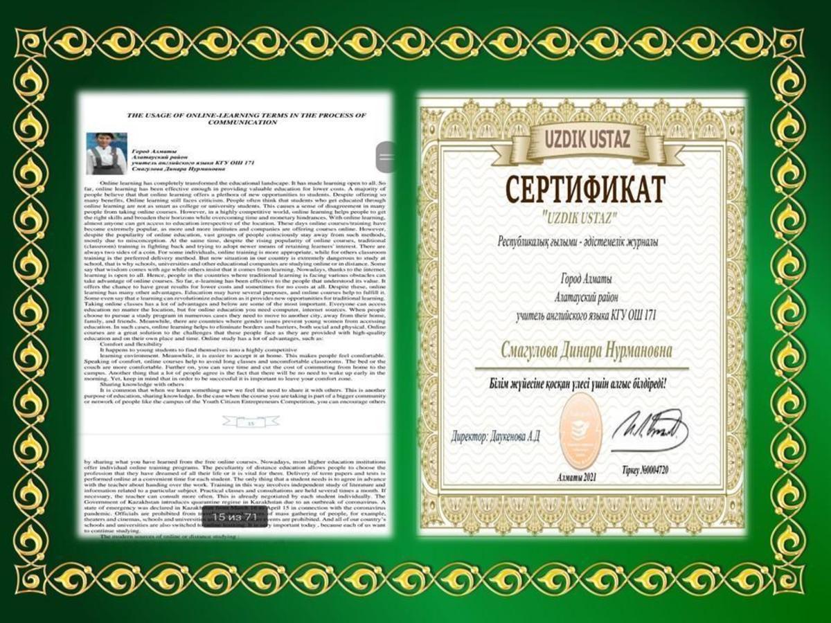 «UZDIK USTAZ» Республикалық ғылыми-әдістемелік журналына (желтоқсан, 2021 жыл) «THE USAGE OF ONLINE-LEARNING TERMS IN THE PROCESS OFCOMMUNICATION» тақырыбында мақала жариялап, білім жүйесіне үлес қосқаны үшін Смагулова Динара Нурмановна марапатталды.