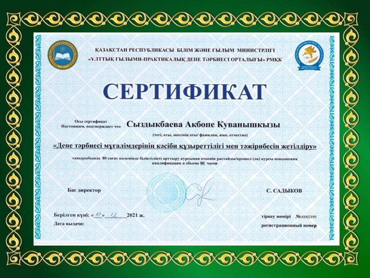 №171 жалпы білім беретін мектептің дене тәрбиесі мұғалімі Сыздыкбаева Акбопе Куанышевна «Дене тәрбиесі мұғалімдерінің кәсіби құзіреттілігі мен тәжірибесін жетілдіру» тақырыбында 80 сағаттық көлемінде біліктілік арттыру курсынан өтті.