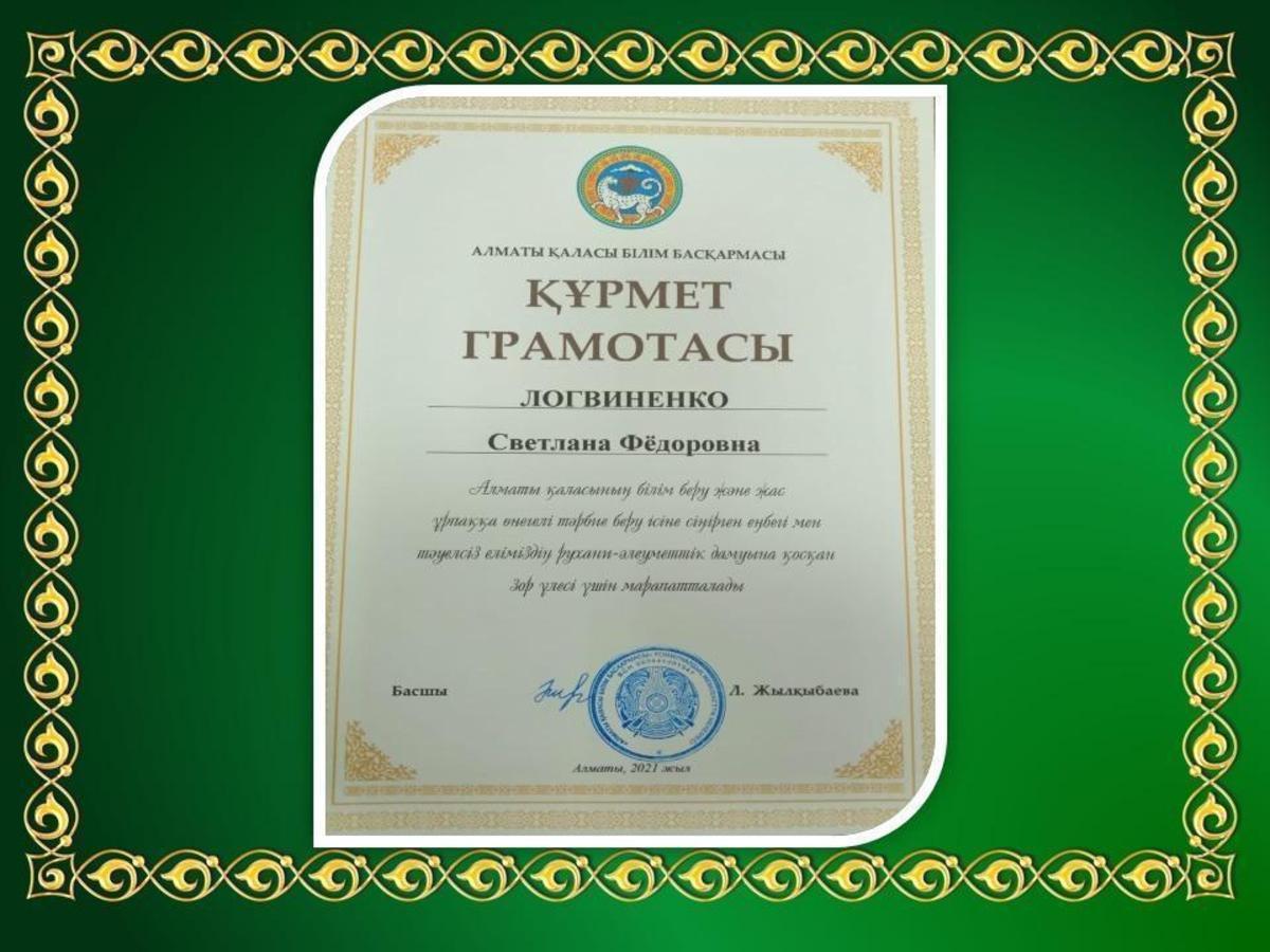Алматы қаласы Білім басқармасы білім беру және жас ұрпаққа өнегелі тәрбие беру ісіне сіңірген еңбегі мен тәуелсіз еліміздің рухани-әлеуметтік дамуына қосқан зор үлесі үшін №171 ЖББ мектептің мұғалімі Логвиненко Светлана Фёдоровнаны марапаттады.