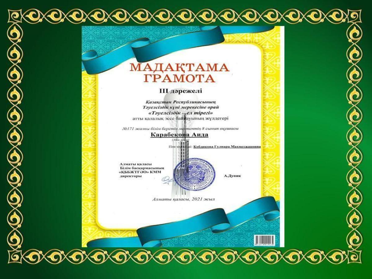 Қазақстан Республикасының Тәуелсіздік күніне орай өткізілген «Тәуелсіздік – ел тірегі» атты қалалық эссе байқауының жүлдегері №171 ЖББ мектебінің 8 «Б» сынып оқушысы Қарабекова Аида марапатталды.