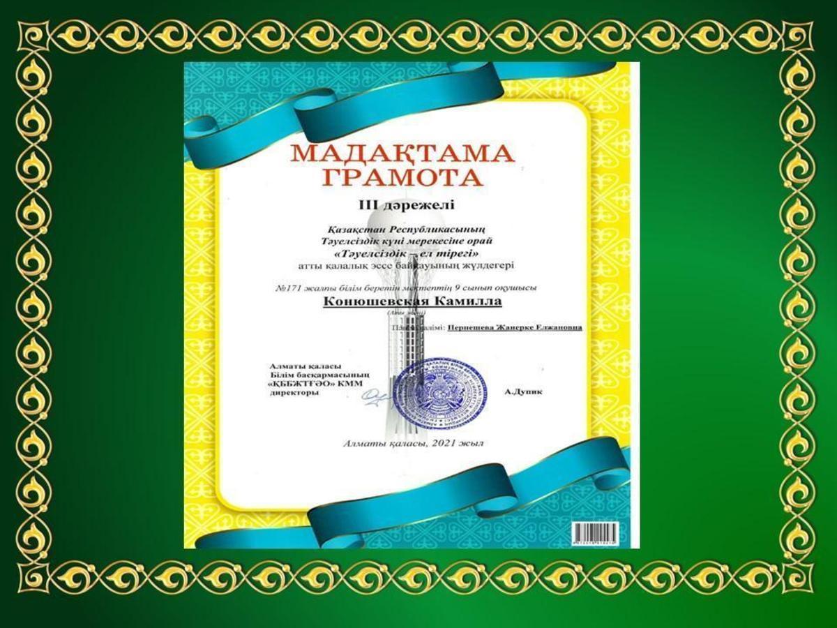 Қазақстан Республикасының Тәуелсіздік күніне орай өткізілген «Тәуелсіздік – ел тірегі» атты қалалық эссе байқауының жүлдегері №171 ЖББ мектебінің 9 "Б" сынып оқушысы Конюшевская Камилла марапатталды.