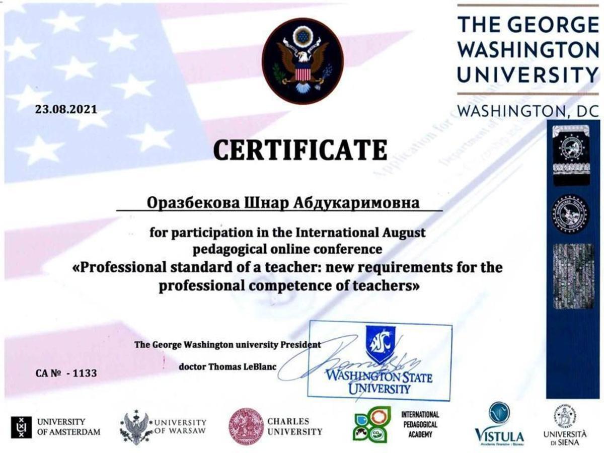 Награждается сертификатом Оразбекова Шнар Абдукаримовна за участие в августовской международной педагогической онлайн-конференции «Профессиональный стандарт учителя: новые требования к профессиональной компетентности учителя».