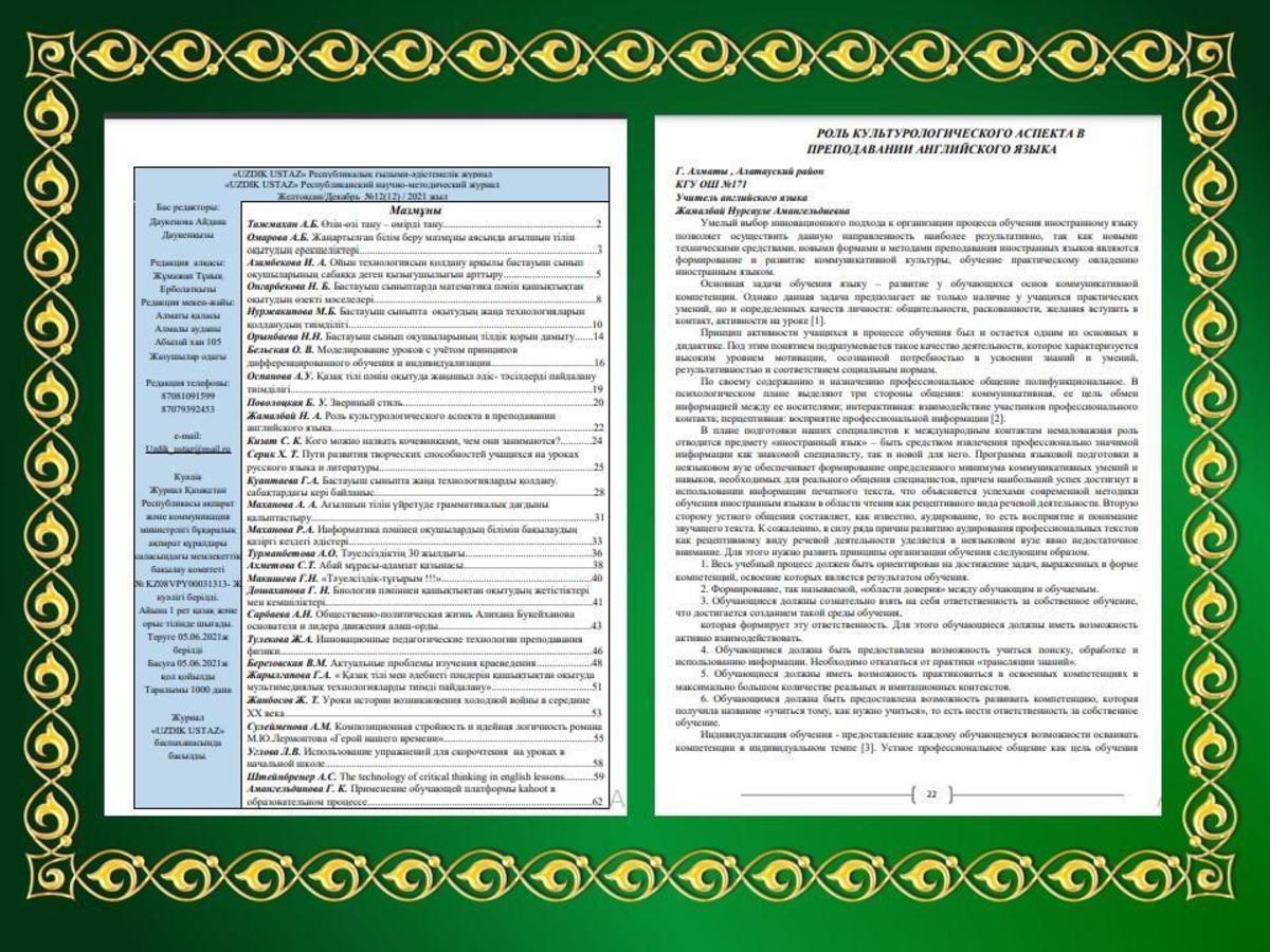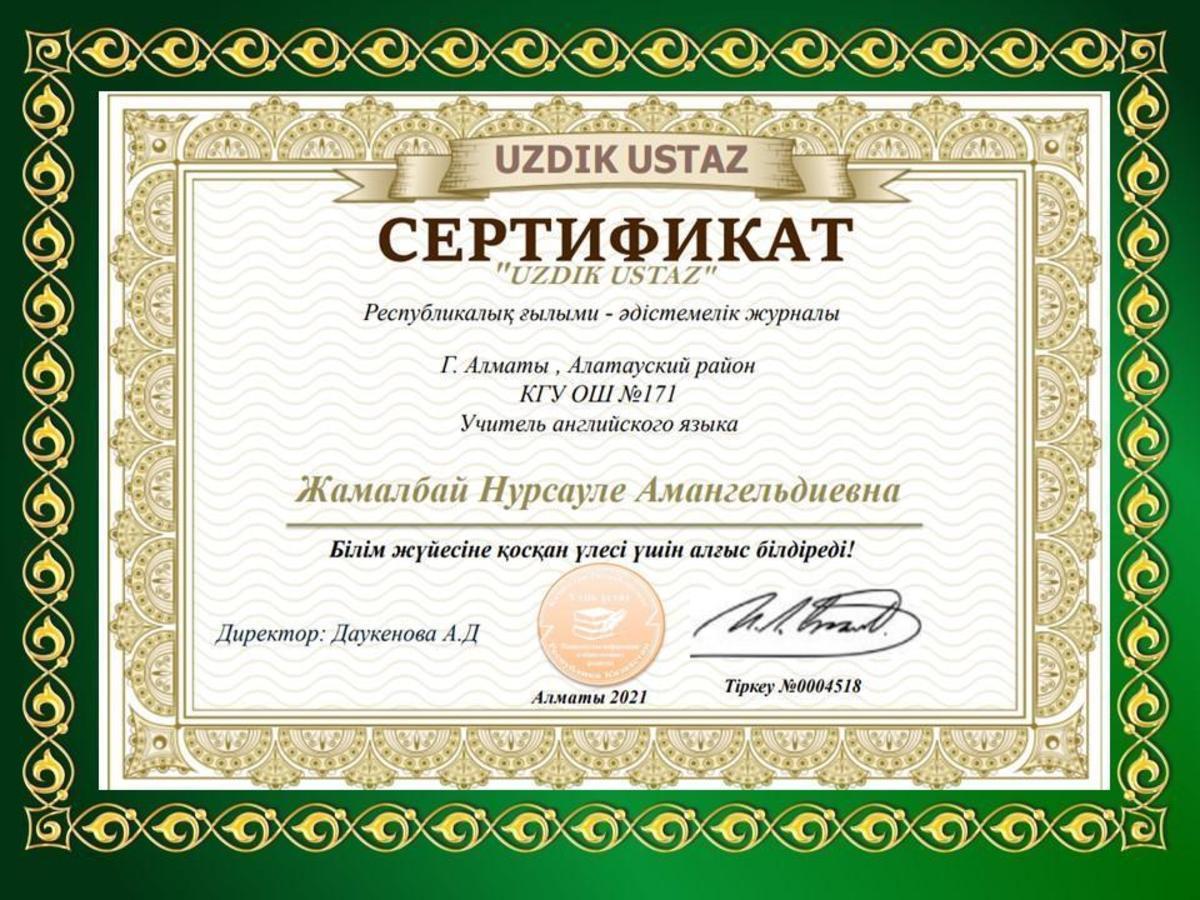 «UZDIK USTAZ» республикалық ғылыми-әдістемелік журналына (12 желтоқсан, 2021 жыл) «THE USAGE OF ONLINE-LEARNING TERMS IN THE PROCESS OF COMMUNICATION» тақырыбында мақала жариялап, білім жүйесіне үлес қосқаны үшін Жамалбай Нурсауле Амангельдиевна марапатталды.