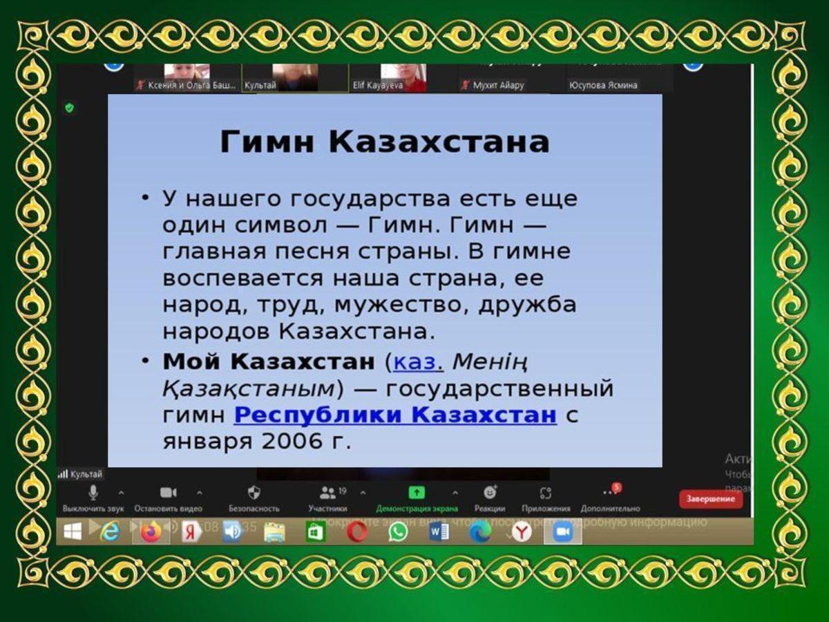 Цели: углубление знаний учащихся о символах Республики Казахстан.