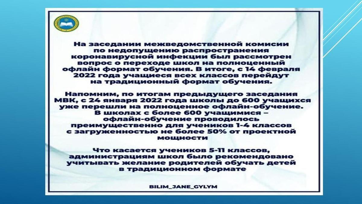 На заседании межведомственной комисии по недопущению распространения коронавирусной инфекции был рассмотрен вопрос о переходе школ на полноценный офлайн формат обучения. В итоге, с 14 февраля 2022 года учащиеся всех классов перейдут на традиционный формат обучения.