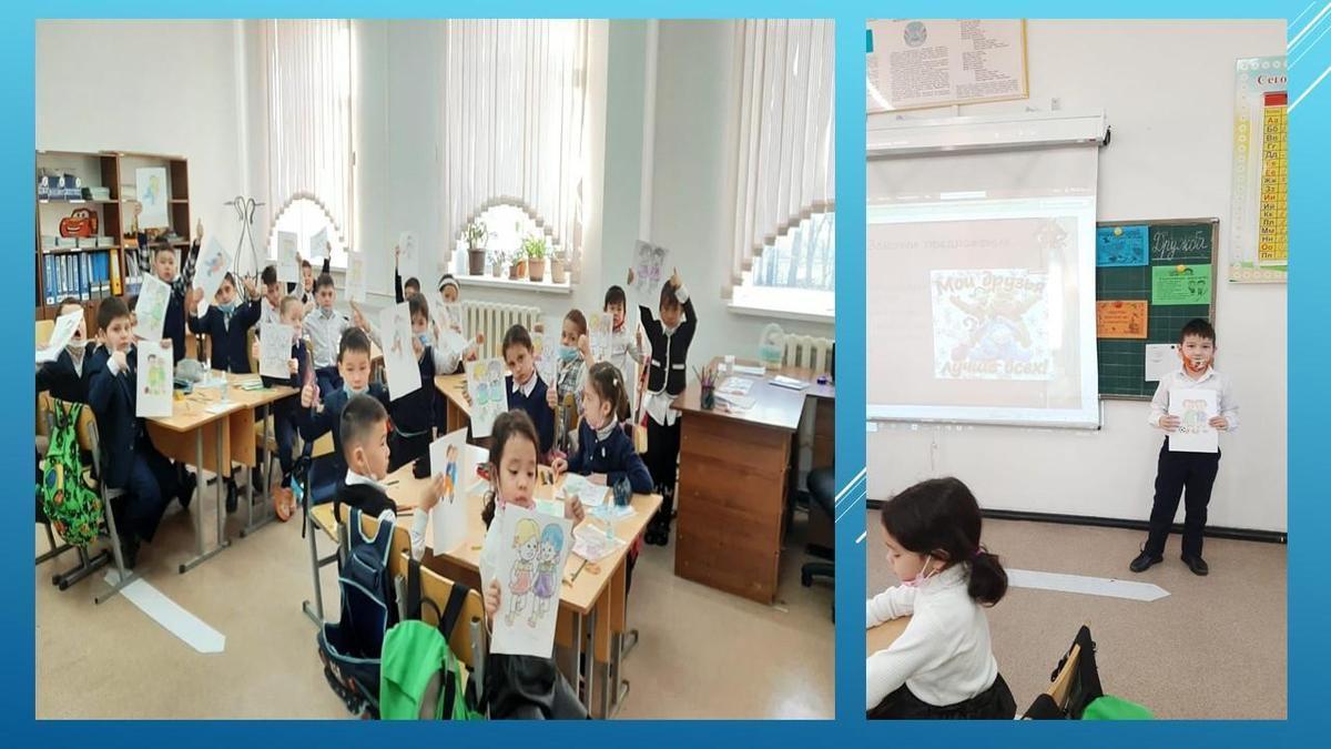 Классный час в 1-х классах по программе «Ел жастары»: «Друг в беде не бросит» направлен на формирование сплочённого коллектива, воспитание нравственных качеств учащихся: умение дружить, беречь дружбу, развитие умения учащихся вести рассуждения.