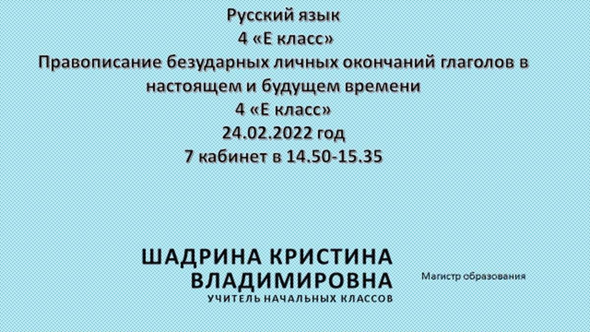 Учитель начальных классов Шадрина Кристина Владимировна провела открытый урок в 4 "Е" классе по русскому языку на тему "Правописание безударных личных окончаний глаголов в настоящем и будущем времени".