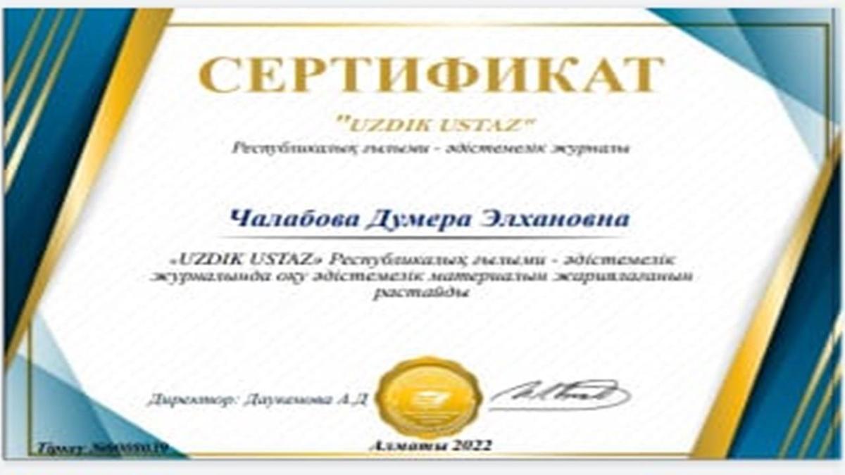 01 март 2022 0 1 2 3 4 5 Чалабова Думера Элхановна материал жариялады Чалабова Думера Элхановна «UZDIK USTAZ» республикалық ғылыми-әдістемелік журналында оқу әдістемелік материалын жариялағанын растайды. Осы беттің QR-коды:QR-код этой страницы: