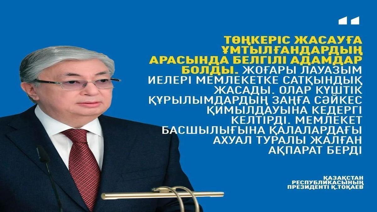 «Бүгінгі жолдаудың мән-маңызы айрықша. Оның арқалайтын жүгі бір жылмен шектелмейді. Біз алдымызға биік мақсаттар қойып отырамыз. Өздеріңізбен бірге Жаңа Қазақстанды құруға кірістік»- деді ҚР Президенті Қ.Тоқаев.