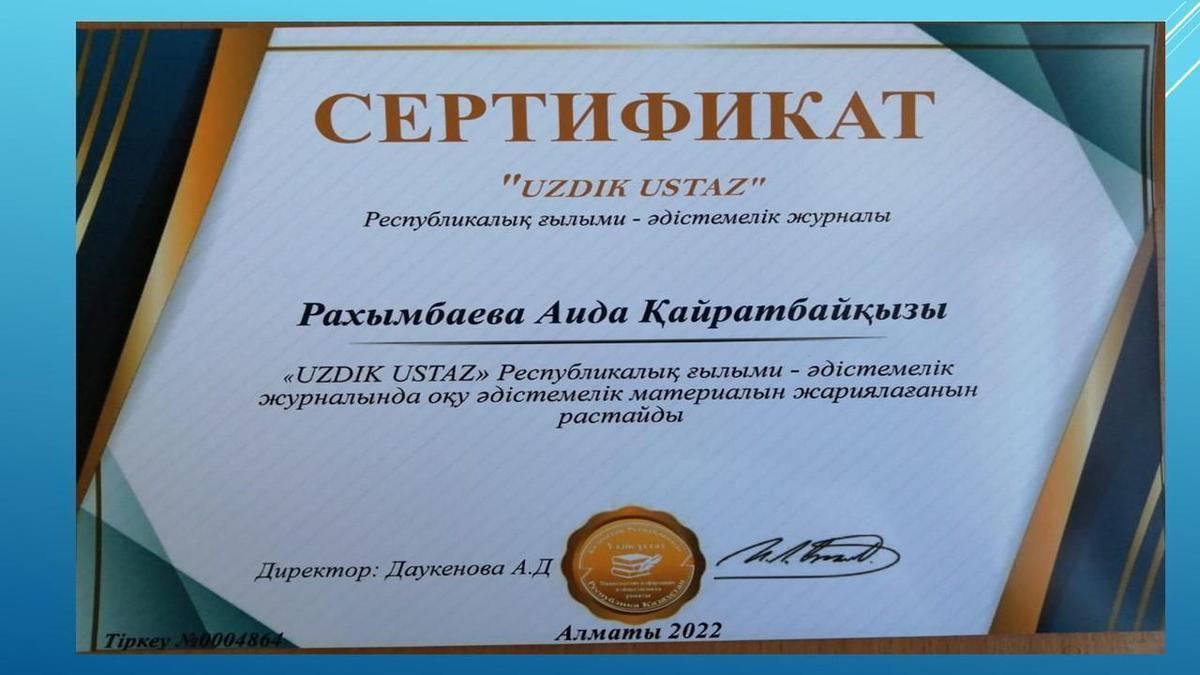 07 апрель 2022 0 1 2 3 4 5 Сертификат алды Рахымбаева Аида Қайратбайқызы «UZDIK USTAZ» республикалық ғылыми-әдістемелік журналында оқу әдістемелік материалын жариялады. Осы беттің QR-коды:QR-код этой страницы: