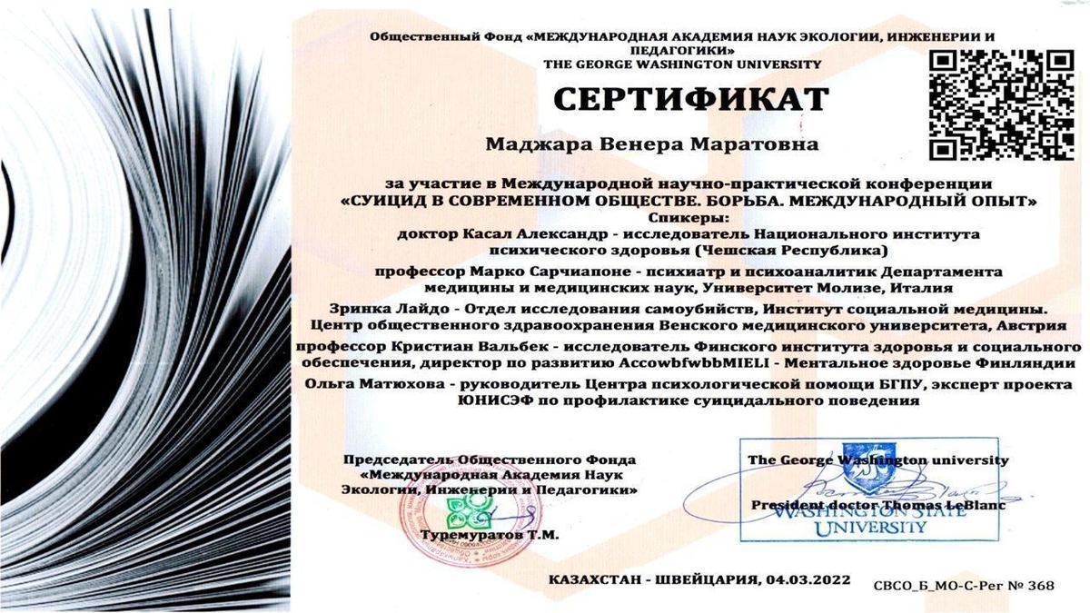 13 апрель 2022 0 1 2 3 4 5 Сертификат за участие в Международной научно-практической конференции Маджара Венера Маратовна получила сертификат за участие в Международной научно-практической конференции "Суицид в современном обществе. Борьба. Международный опыт". Осы беттің QR-коды:QR-код этой страницы: