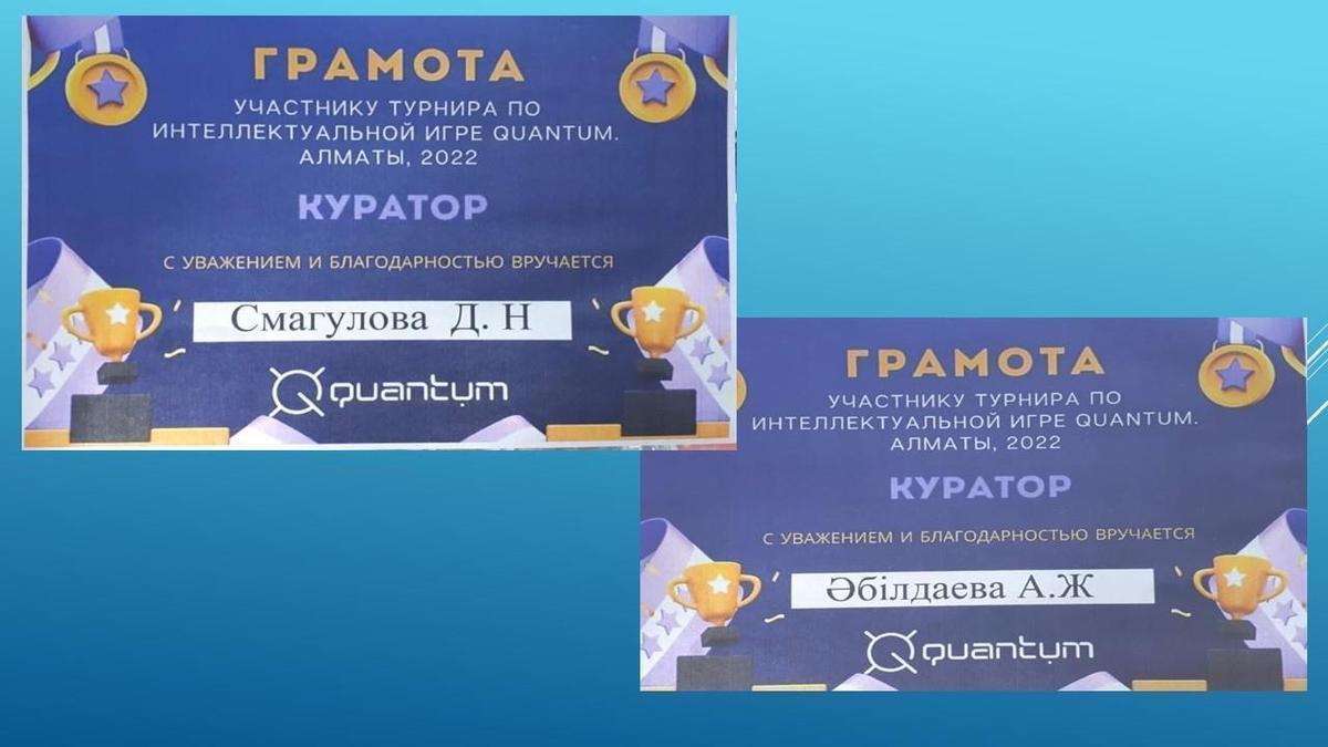 01 июнь 2022 0 1 2 3 4 5 Кураторы Смагулова Д.Н. и Әділдаева А.Ж. награждены грамотой Турнир по интеллектуальной игре «Quantum». Кураторы Смагулова Д.Н. и Әділдаева А.Ж. награждены грамотой. Осы беттің QR-коды:QR-код этой страницы: