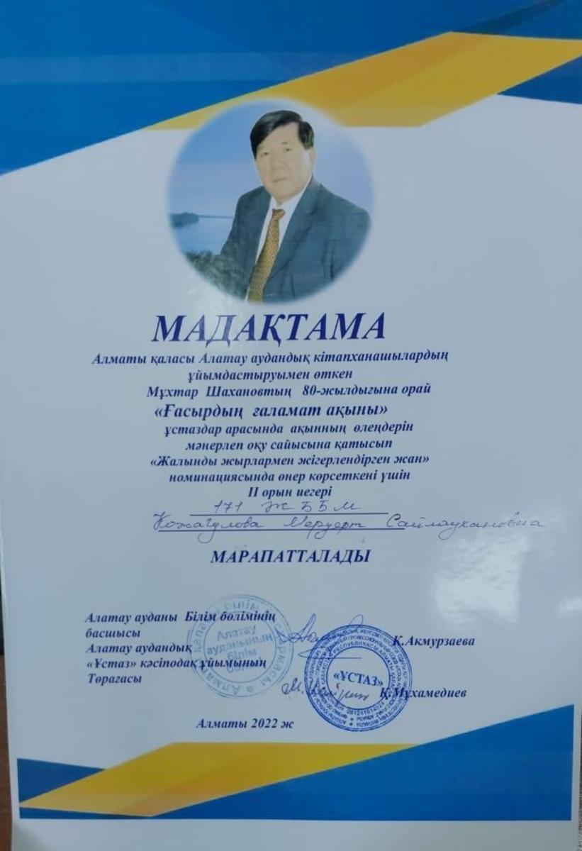 Алматы қаласы Алатау аудандық кітапханашылардың ұйымдастыруымен өткен Мұхтар Шахановтың 80 жылдығына орай “Ғасырдың ғаламат ақыны” ұстаздар арасында ақынның өлеңін мәнерлеп оқу, талдау, ақынға арнау сайысына қатысып “Жалынды жырлармен жігерлендірген жан” номинациясында өнер көрсеткені үшін 2-орын иегері №171 ЖББМ қазақ тілі мен әдебиеті пәні мұғалімі Қожагулова Меруерт марапатталды.