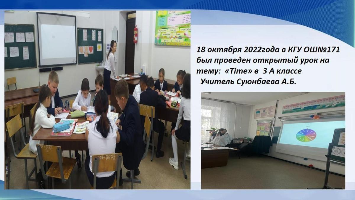 18 октябрь 2022 0 1 2 3 4 5 Открытый урок на тему: «Time» Проведен открытый урок на тему: «Time» в 3 А классе. Учитель Суюнбаева А.Б. Осы беттің QR-коды:QR-код этой страницы: