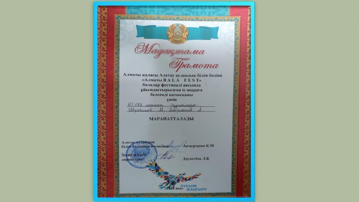 Алматы қаласы Алатау ауданы білім бөлімі «Алматы B A L A F E S T» Балалар фестивалі аясында ұйымдастырылған іс-шараға белсенді қатысқаны үшін М. Ибрагимов пен А. Әмірметов марапатталды.