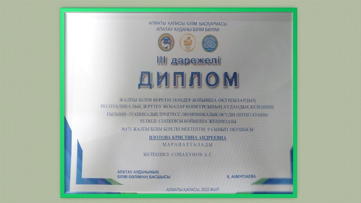 Алматы қаласы Алатау ауданы: Жалпы білім беретін пәндер бойынша оқушылардың республикалық зерттеу жобалар конкурсының аудандық кезеңінің ғылыми-техникалық прогресс - экономикалық өсудың негізгі буыны ретінде секциясы бойынша 9"Б" сынып оқушысы Изотова Кристина марапатталады.