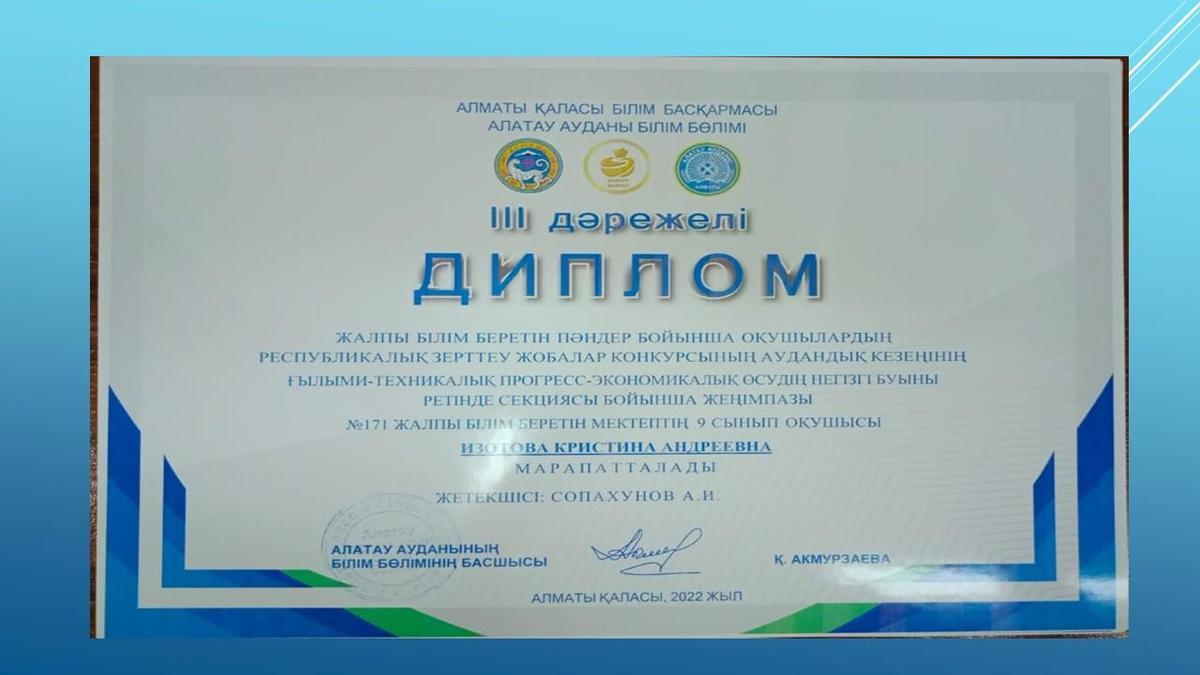 Дипломом III степени награждена ученица 9 класса СОШ №171 Изотова Кристина, которая является основным звеном научно-технического прогресса-экономического роста районного этапа республиканского конкурса исследовательских проектов учащихся по общеобразовательным предметам Алатауского района города Алматы.