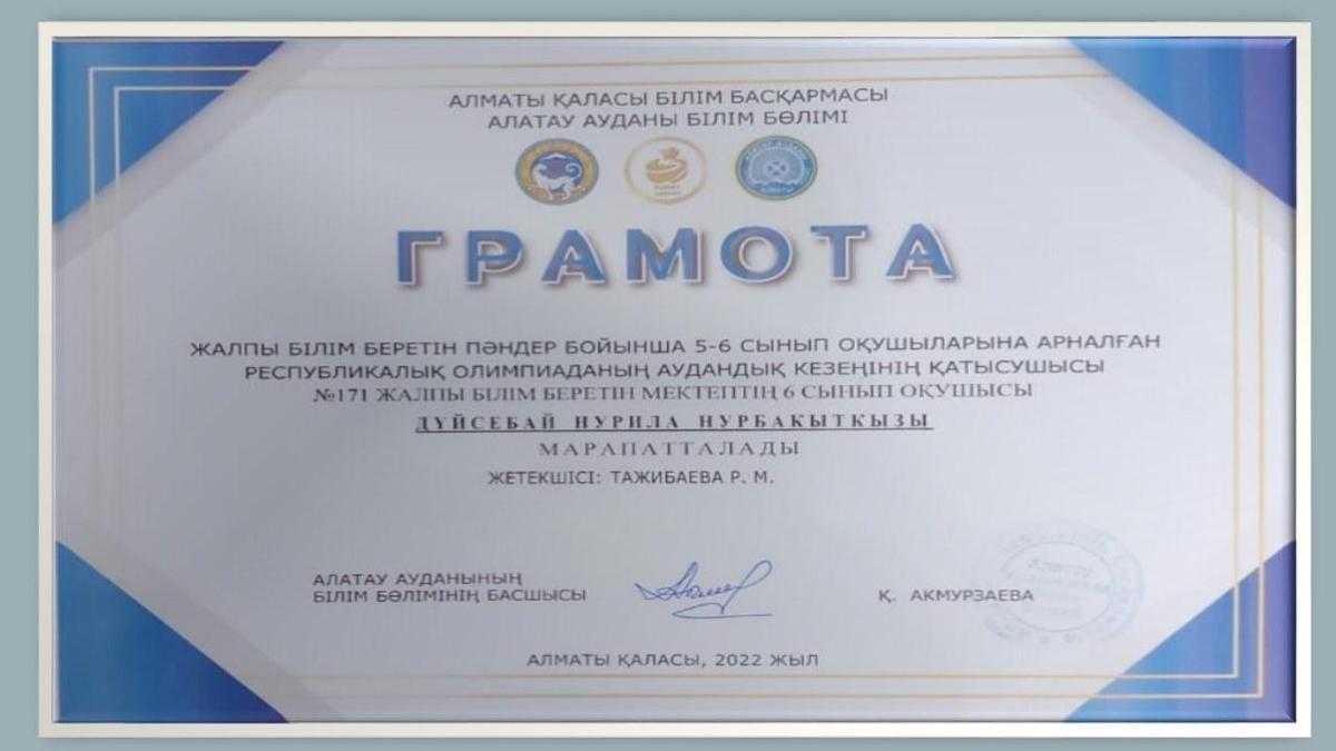 22 декабрь 2022 0 1 2 3 4 5 Дүйсебай Нурила марапатталды Алматы қаласы Алатау ауданы ЖББ пәндер бойынша 5-6 сынып оқушыларына арналған республикалық олимпиаданың аудандық кезеңіне қатысқаны үшін №171 ЖББ мектептің 6-сынып оқушысы Дүйсебай Нурила марапатталды. Осы беттің QR-коды:QR-код этой страницы: