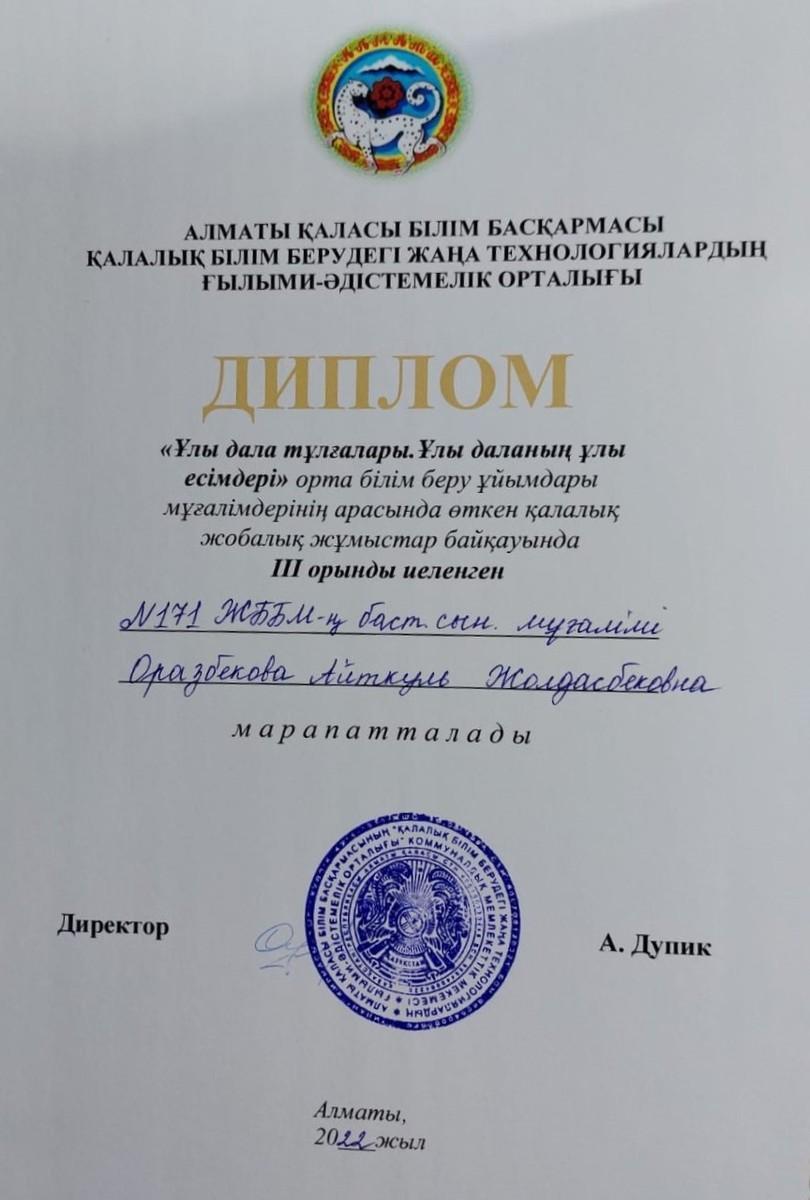 Алматы қаласы білім басқармасы қалалық білім берудегі жаңа технологиялардың ғылыми-әдістемелік орталығында "Ұлы дала тұлғалары. Ұлы даланың ұлы есімдері" орта білім беру ұйымдары мұғалімдерінің арасында өткен қалалық жобалық жұмыстар байқауында III орынды иеленген №171 ЖББМ-ң бастауыш сынып мұғалімі Оразбекова Айткуль Жолдасбековна марапатталды.