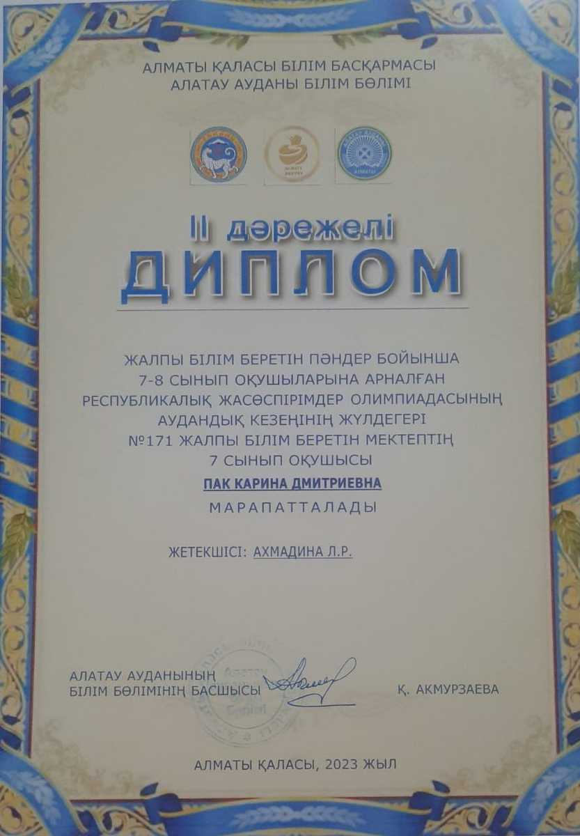 Жалпы білім беретін пәндер бойынша 7-8 сынып оқушыларына арналған республикалық жасөспірімдер олимпиадасының аудандық кезеңінің жүлдегері №171 жалпы білім беретін мектептің 7 сынып оқушысы Пак Карина II дәрежелі дипломмен марапатталды.