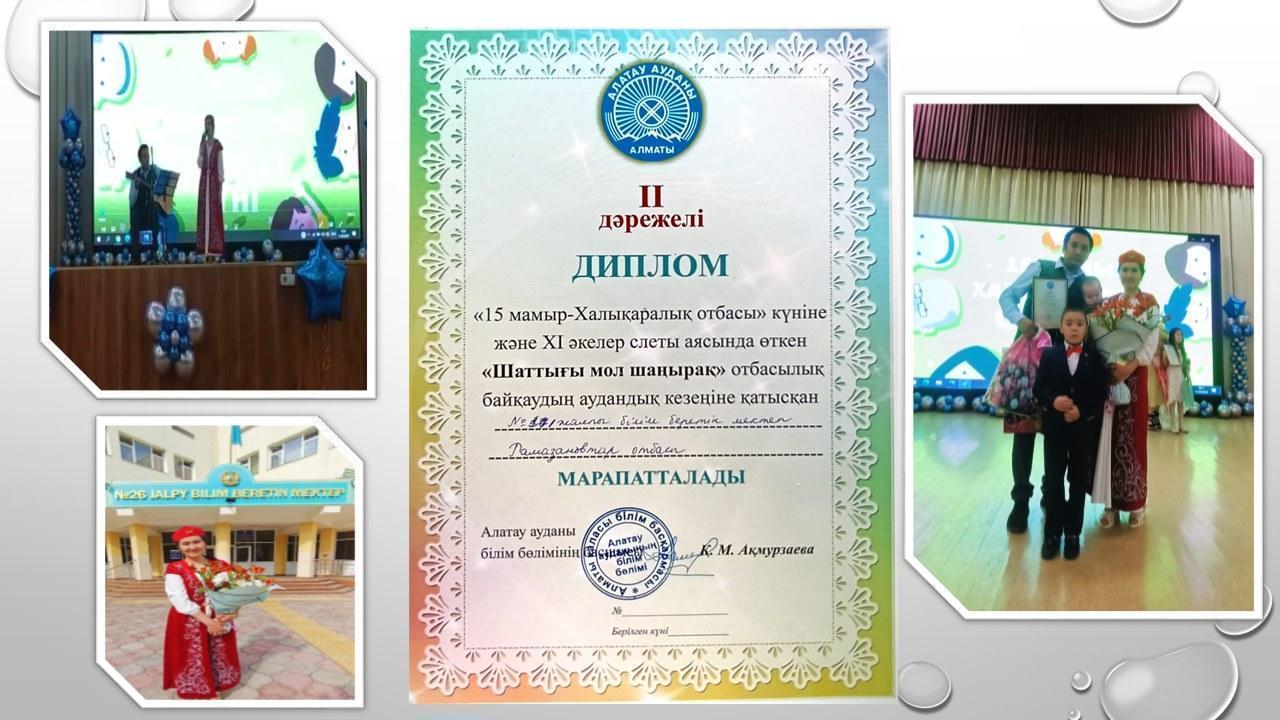 15 мамыр Халықаралық отбасы күніне және Xl әкелер слеты аясында өткен “Шаттығы мол шаңырақ “отбасылық байқаудың аудандық кезеңіне қатысып №171 ЖББ мектеп жеңімпазы Рамазановтар отбасы ll дәрежелі дипломмен марапатталды.