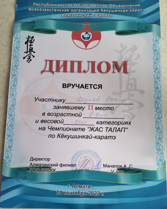 27 сентябрь 2023 0 1 2 3 4 5 4-сынып оқушысы Рамин Дадаев марапатталды Киокушинкай каратэден «Жас талап» чемпионатында 2-орын алған 4-сынып оқушысы Рамин Дадаев марапатталды.Награждается ученик 4 г класса Дадаев Рамин, занявший 2-место на чемпионате «Жас Талап» по Кёкушинкай каратэ. Осы беттің QR-коды:QR-код этой страницы: