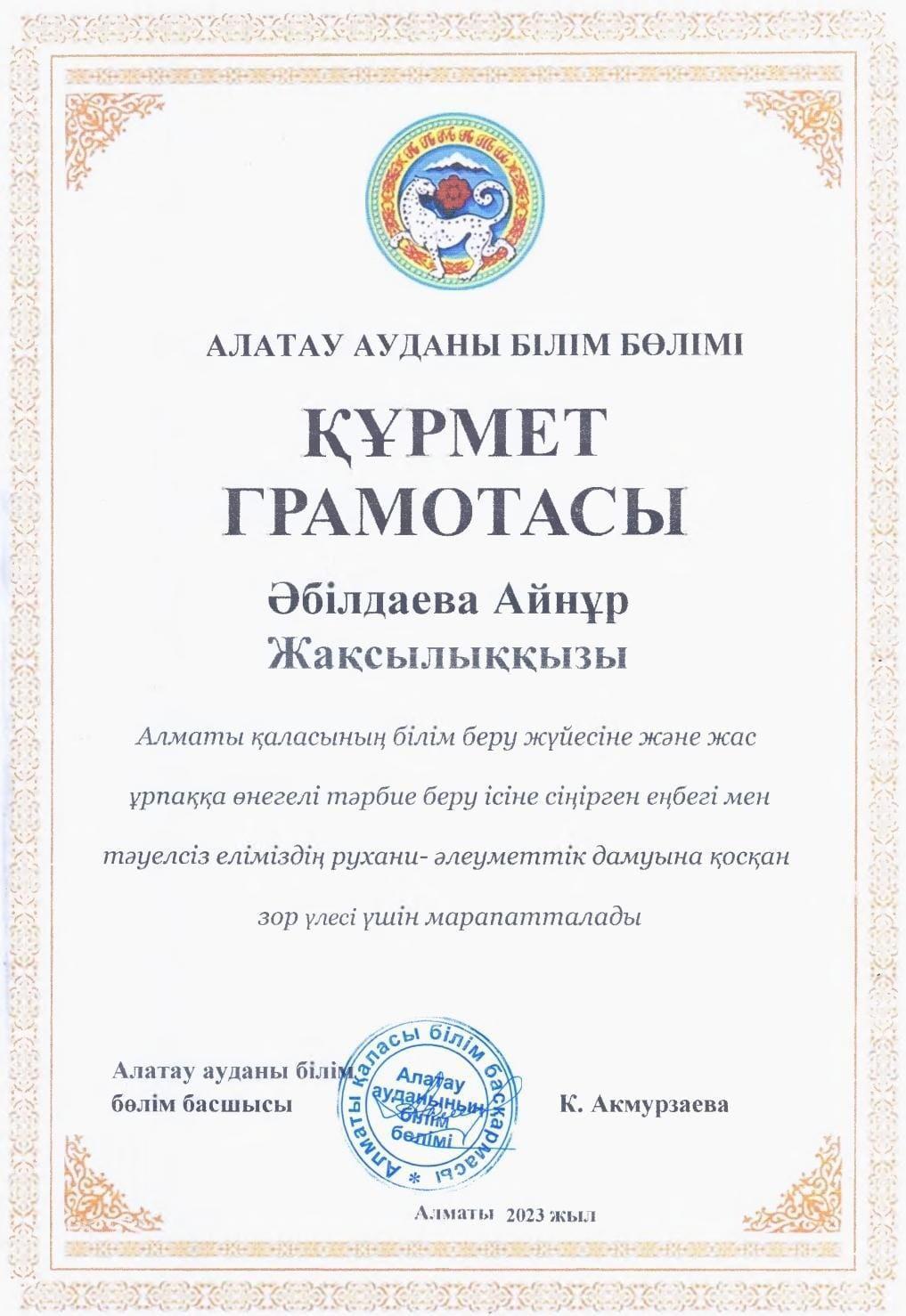 Алатау ауданы білім бөлімі Алматы қаласының білім беру жүйесіне және жас ұрпаққа өнегелі тәрбие беру ісіне сіңірген еңбегі мен тәуелсіз еліміздің рухани-әлеуметтік дамуына қосқан зор үлесі үшін Әбілдаева Айнұр Жақсылыққызы ҚҰРМЕТ ГРАМОТАСЫМЕН марапатталды.
