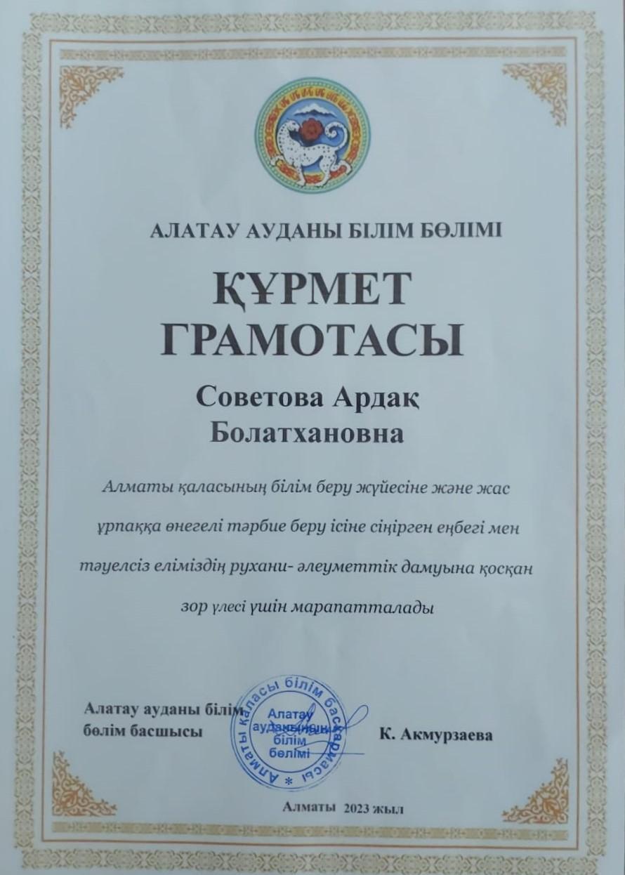 Алатау ауданы білім бөлімі, Алматы қаласының білім беру жүйесіне және жас ұрпаққа өнегелі тәрбие беру ісіне сіңірген еңбегі мен тәуелсіз еліміздің рухани-әлеуметтік дамуына қосқан зор үлесі үшін Советова Ардақ Болатхановна ҚҰРМЕТ ГРАМОТАСЫМЕН марапатталды.