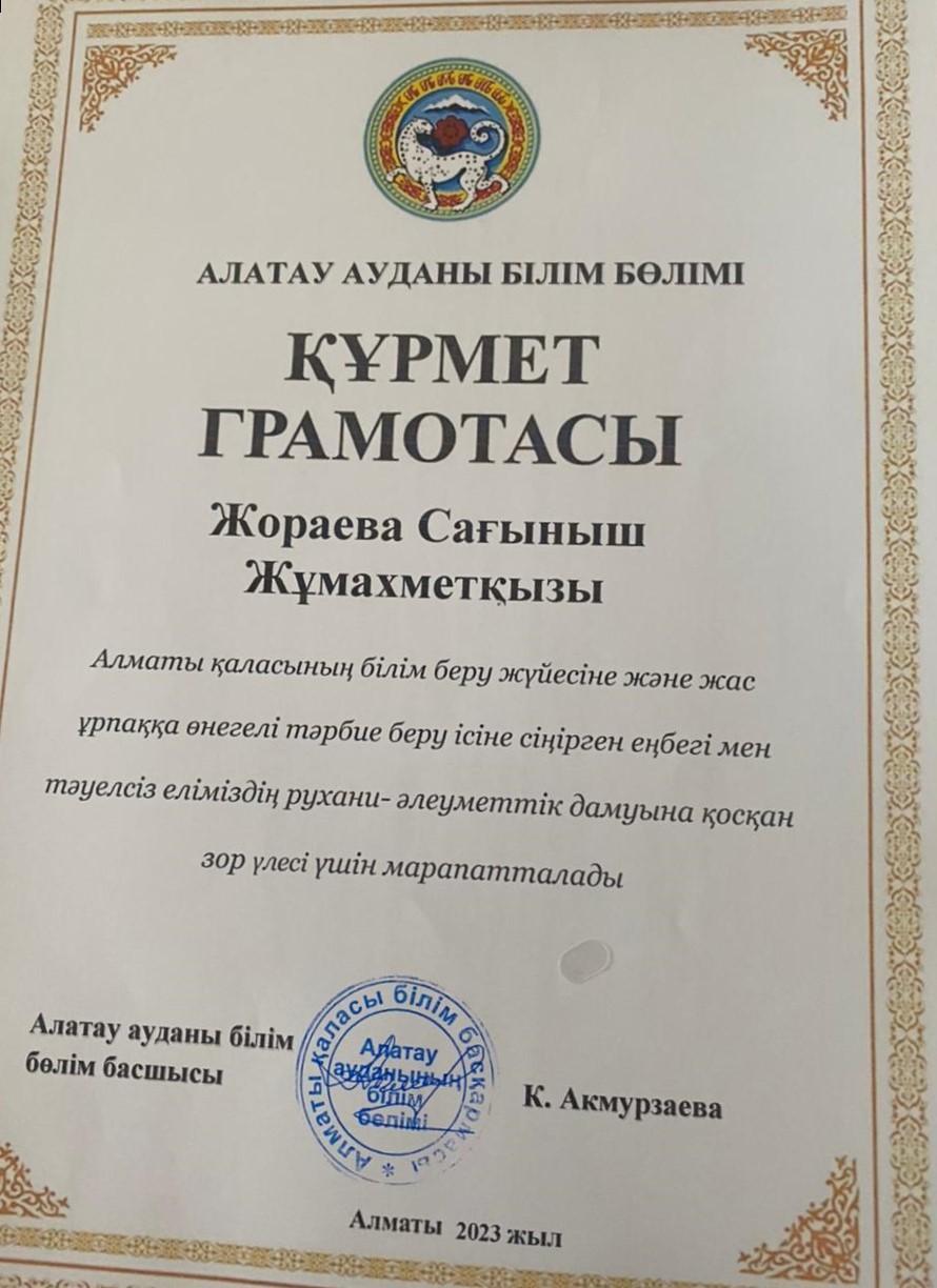 Алатау ауданы білім бөлімі , Алматы қаласының білім беру жүйесіне және жас ұрпаққа өнегелі тәрбие беру ісіне сіңірген еңбегі мен тәуелсіз еліміздің рухани-әлеуметтік дамуына қосқан зор үлесі үшін Жораева Сағыныш Жұмахметқызы ҚҰРМЕТ ГРАМОТАСЫМЕН марапатталды.