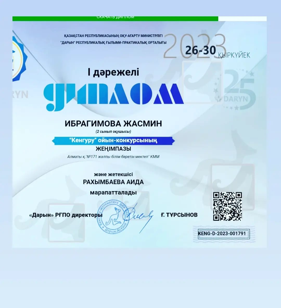 Ибрагимова Жасмин, 2-классница школы №171, награждена дипломом 1-й степени игрового конкурса «Кенгуру», организованного Республиканским научно-практическим центром «Дарын» Министерства образования Республики Казахстан. Также она получила сертификат участника игрового конкурса «Кенгуру».