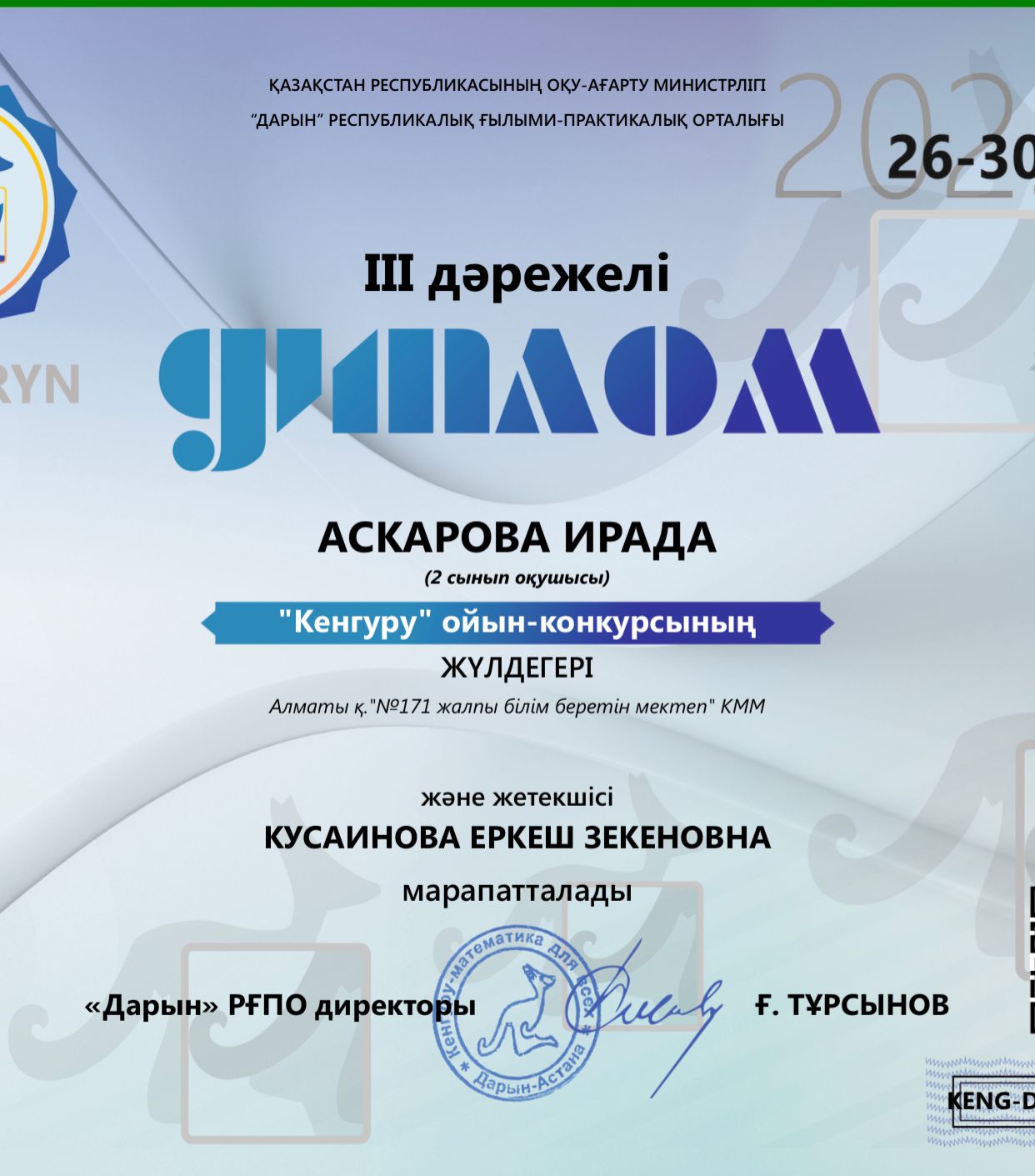 Қазақстан Республикасының Оқу-ағарту министрлігі "Дарын" Республикалық ғылыми-практикалық орталығы ұйымдастырған "Кенгуру" ойын конкурсының IІІ дәрежелі дипломымен №171ЖББ мектептің 2-ші сынып оқушысы Аскарова Ирада марапатталды.