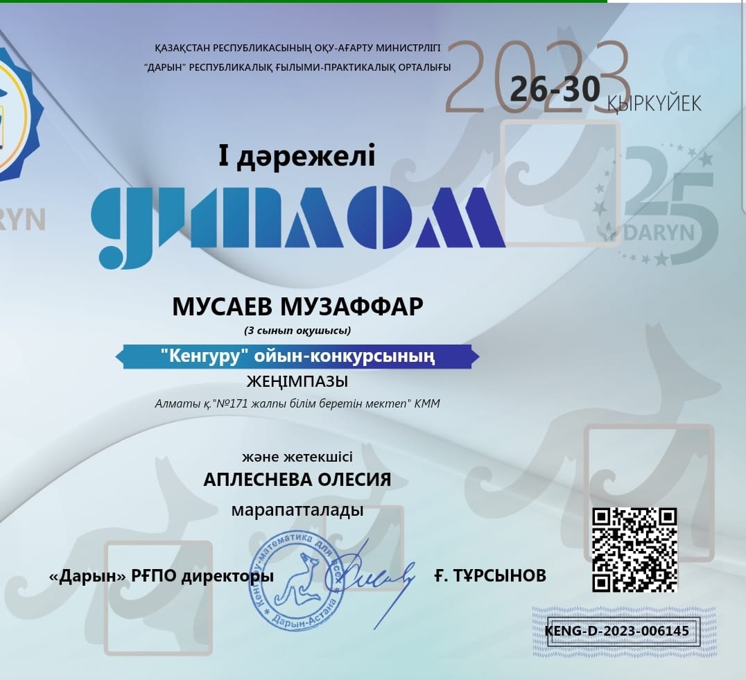 Қазақстан Республикасының Оқу-ағарту министрлігі "Дарын" Республикалық ғылыми-практикалық орталығы ұйымдастырған "Кенгуру" ойын конкурсының І дәрежелі дипломымен №171ЖББ мектептің 3-ші сынып оқушысы Мусаев Музаффар марапатталды.