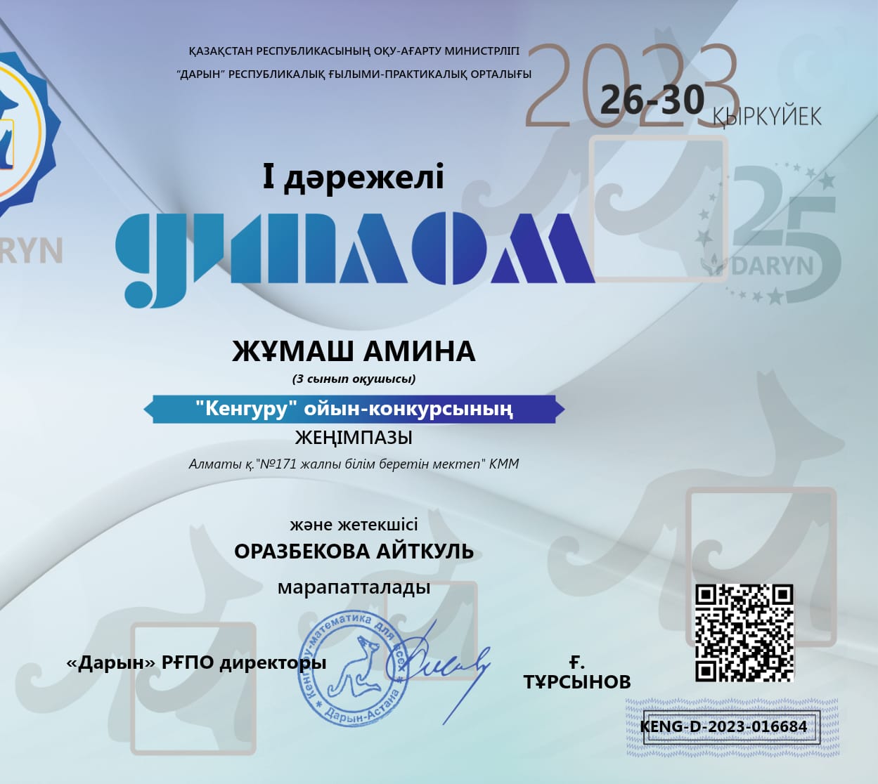 Жұмаш Амина, 3-классница школы №171, награждена дипломом 1-й степени игрового конкурса «Кенгуру», организованного Республиканским научно-практическим центром «Дарын» Министерства образования Республики Казахстан.