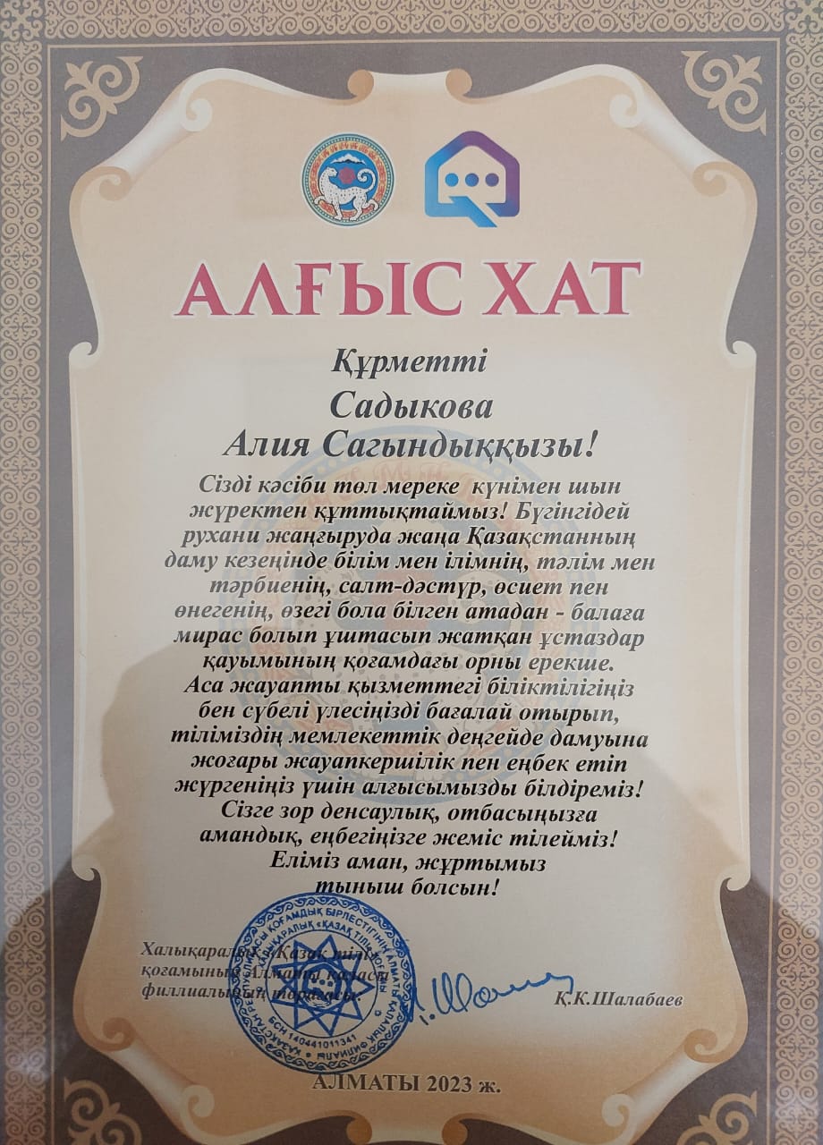 Жаңа Қазақстанның даму кезеңінде білім мен ілімнің , тәлім мен тәрбиенің, салт-дәстүрдің, өсиет пен өнегенің өзегі бола білген Садыкова Алия Сағындыққызын кәсіби мұғалімдер күнімен шын жүректен құттықтаймыз! Атадан-балаға мирас болып ұштасып жатқан ұстаздар қауымының қоғамдағы орны ерекше екенін ескере отырып, аса жауапты қызметтегі біліктілігі мен сүбелі үлесін бағалай біліп, тіліміздің мемлекеттік деңгейде дамуына жоғары жауапкершілікпен еңбек етіп жүргені үшін Садыкова Алия Сағындыққызы марапатталады.