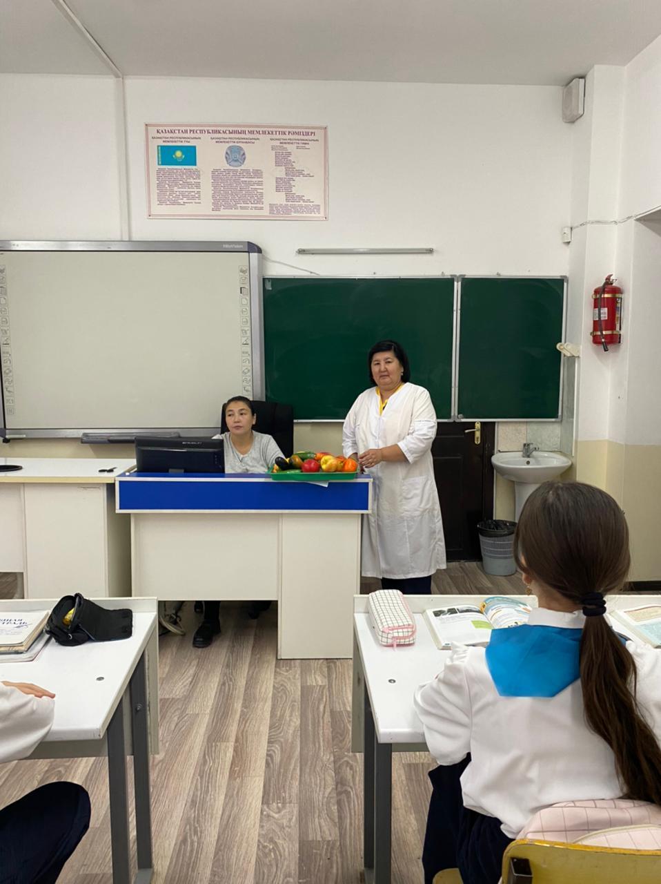 "Бес күн - бес іс - шара" жобасы аясында, 2 - ші күн шығармашылық күн, мектебіміздің медбикесі Кульбасова Светлана Фазылжанқызымен кездесу "Дұрыс тамақтану" тақырыбында өтті.