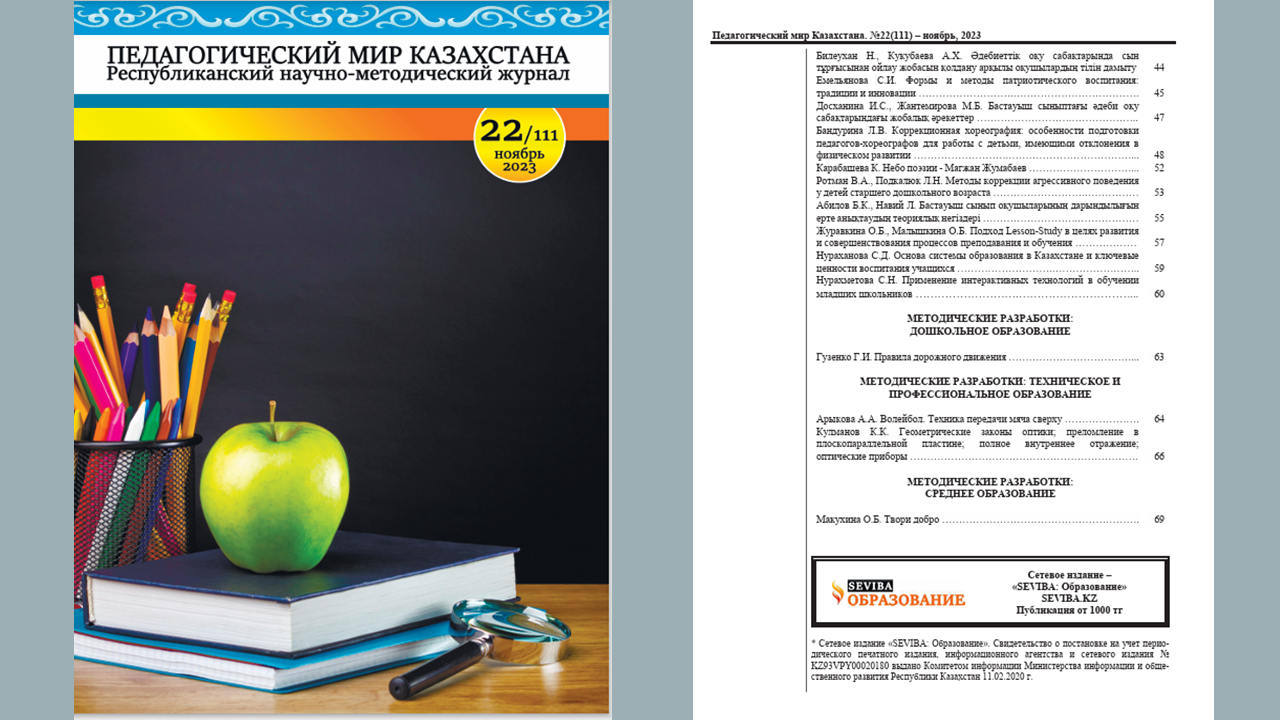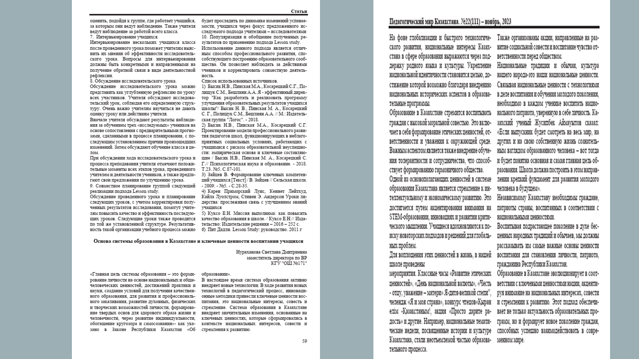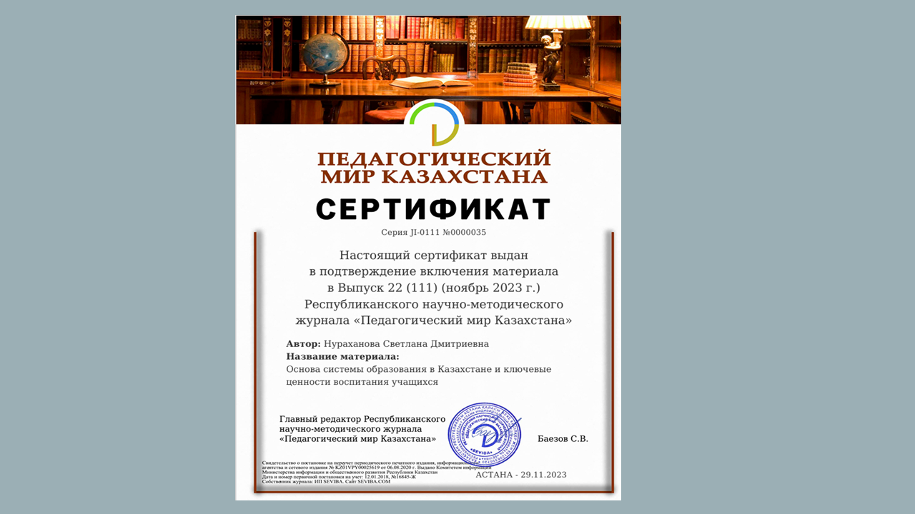 Сертификат выдан Нурахановой С.Д. в подтверждения включения материала в выпуск 22 /111/ /ноябрь 2023г./ республиканского научно-методического журнала «Педагогический мир Казахстана». Название статьи- «Основа системы образования в Казахстане и ключевые ценности воспитания учащихся»