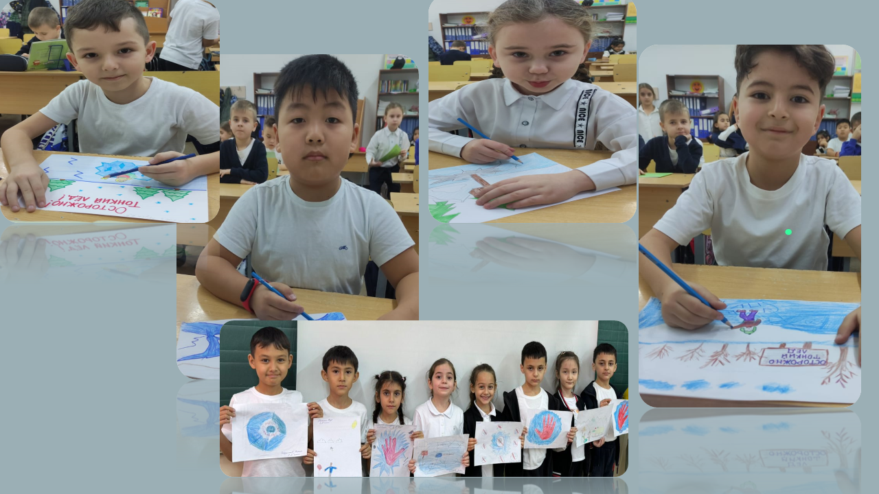 Балаларды қыс мезгілінде су айдындарында өзін ұстау мәдениетін қалыптастыру мақсатында 1-4 сыныптар арасында «Абайлаңыз, жұқа мұз!» тақырыбында сурет байқауы өткізілді.