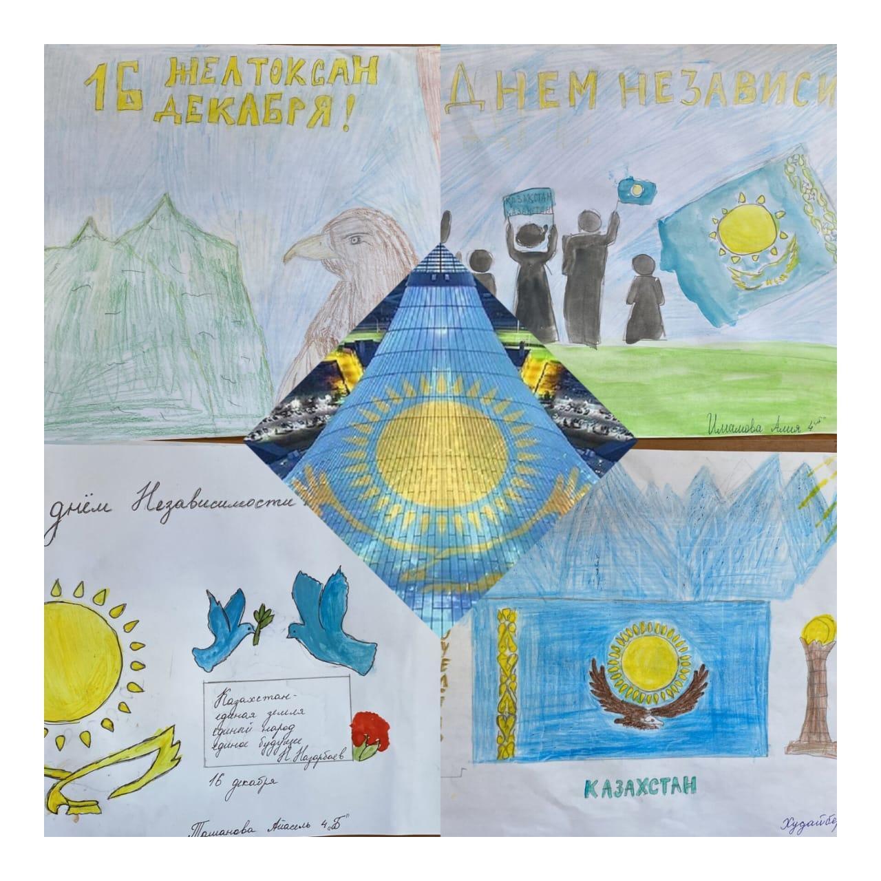 День независимости Казахстана — главный национальный праздник Республики Казахстан. Эта дата отмечается в Казахстане ежегодно 16 декабря. Учащиеся 4-х классов приняли участие в конкурсе рисунков «Тәуелсіз Қазақстан балалар көзімен» ко Дню Независимости.